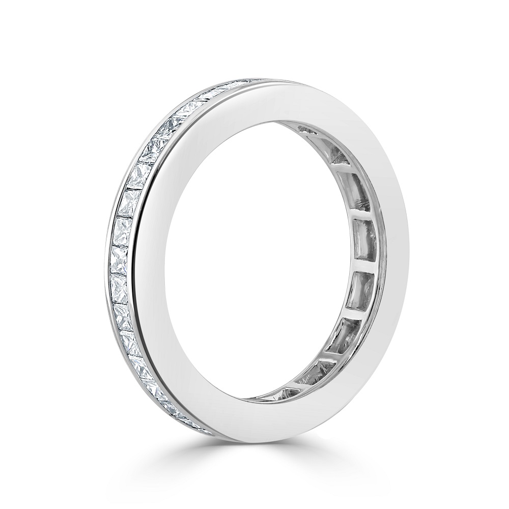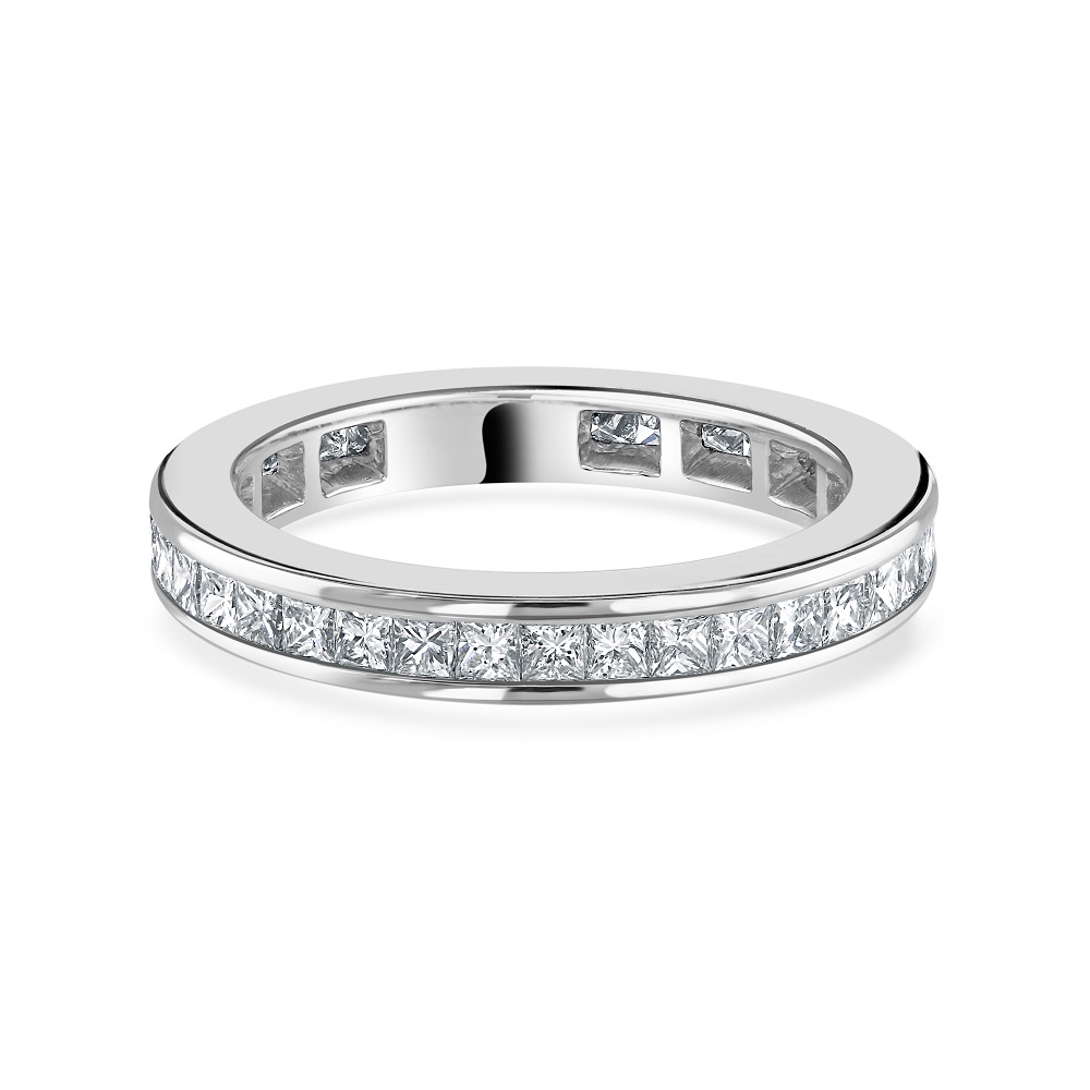 Our elegant platinum full eternity ring is a symbol of everlasting love and commitment. This exquisite ring is channel-set with princess cut diamonds around the entire band, showcasing a total diamond weight of 1.30 carats. Each diamond is meticulously selected and set to highlight its geometric precision and brilliance, offering a continuous circle of sparkle. Crafted from premium platinum, known for its durability and sleek finish, this eternity ring is designed for those who appreciate a blend of modern luxury and classic style. Perfect for an anniversary, wedding band, or as a cherished keepsake, this ring offers unmatched radiance and sophistication that will be treasured for generations.