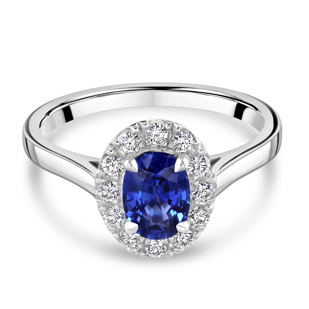 A refined statement of timeless elegance, this platinum cluster ring features a captivating 1.02 carat oval-cut sapphire, held securely in a classic four-claw setting. The sapphire’s rich, velvety hue is beautifully complemented by a radiant halo of twelve micro claw-set round brilliant-cut diamonds, with a total weight of 0.21 carats. Expertly crafted in luxurious platinum, the design balances modern precision with traditional charm, allowing the central gemstone to take centre stage while the surrounding diamonds add a delicate brilliance. A sophisticated piece, perfect for marking life’s most meaningful moments or elevating any fine jewellery collection.