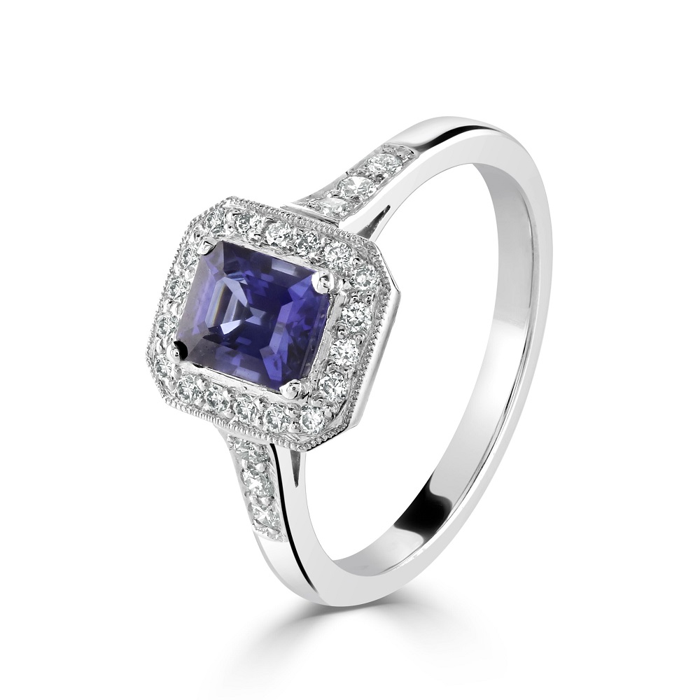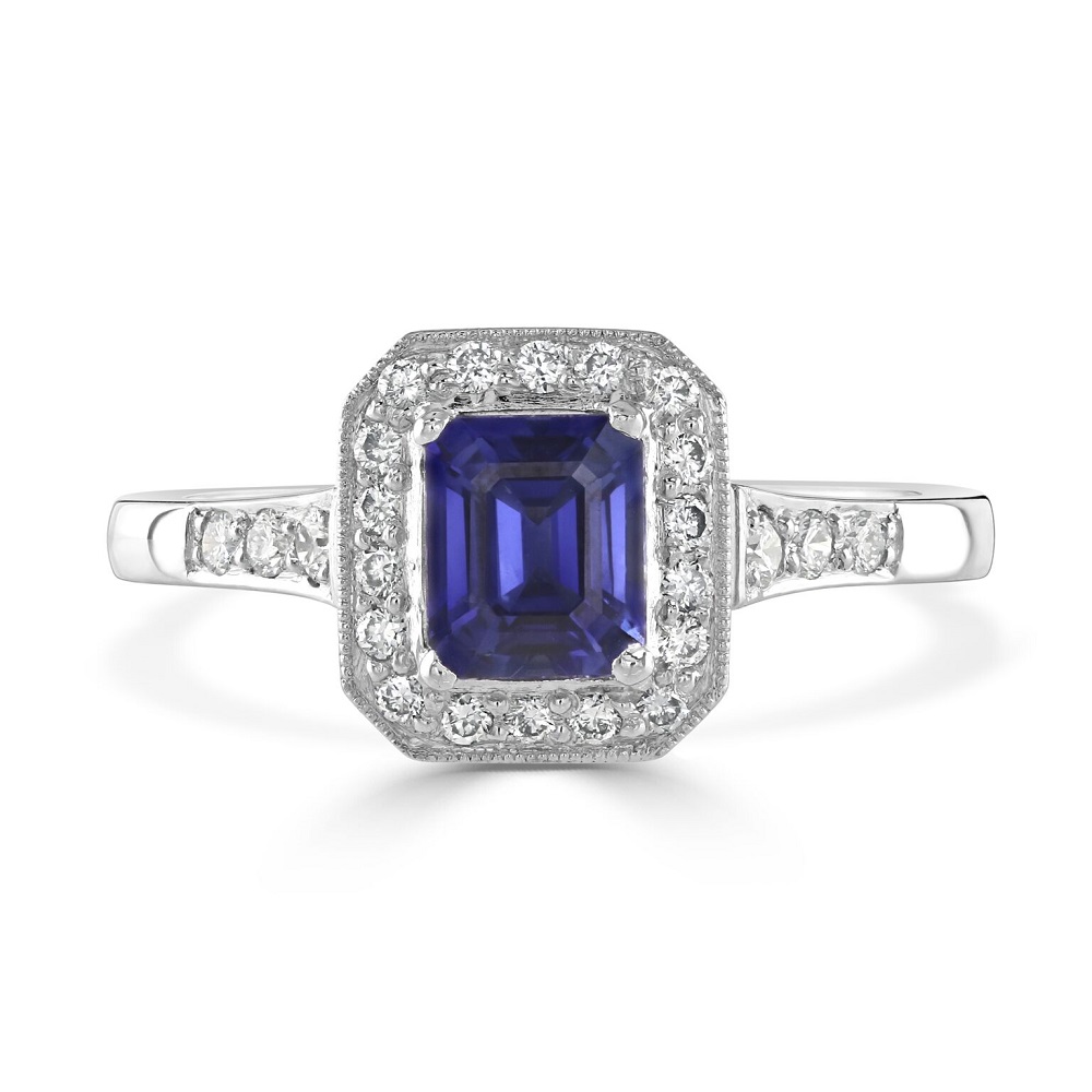 An exquisite platinum sapphire and diamond halo ring. This luxurious ring features a striking centre rectangular sapphire, weighing 0.91ct, its deep blue hues embodying the essence of sophistication and timeless beauty. Encircling this magnificent sapphire is a halo of pavé set diamonds, meticulously arranged to enhance the centrepiece’s luminosity and add an extra layer of sparkle. With a total diamond weight of 0.24ct, these diamonds complement the sapphire's allure, creating a captivating display of brilliance.