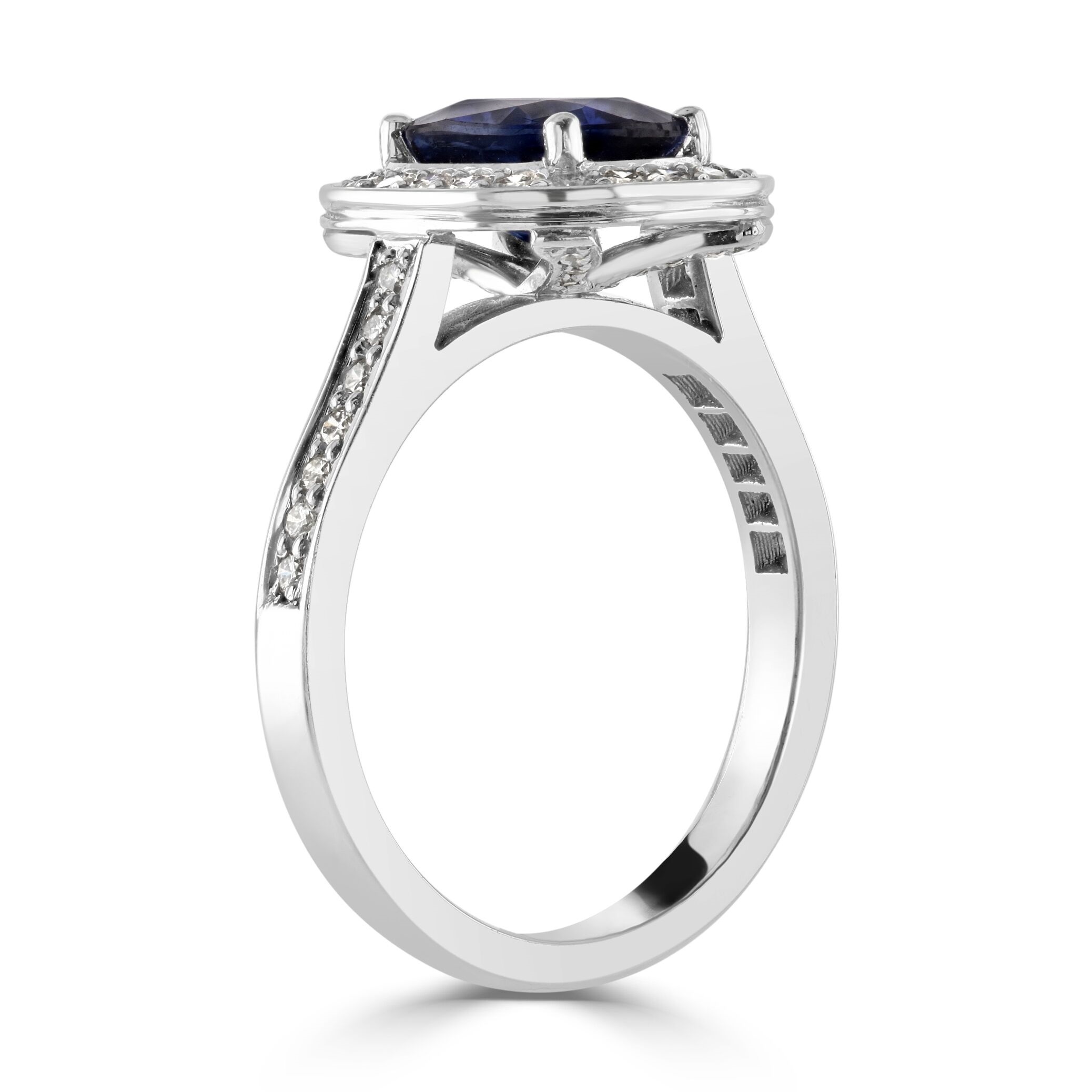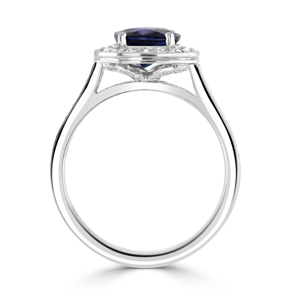 The sophistication of this ring extends down the band with diamond-set shoulders, adding to the overall brilliance and elegance of the piece. Crafted from premium platinum, known for its strength and sleek finish, this sapphire and diamond halo ring is designed to dazzle and charm, making it an ideal choice for those who appreciate the fine interplay of luxurious gemstones and precious metals.