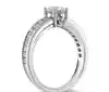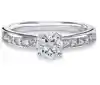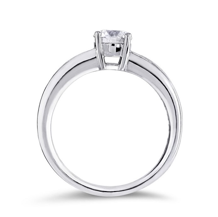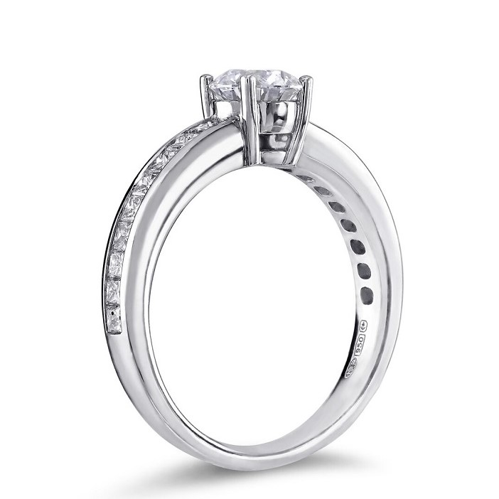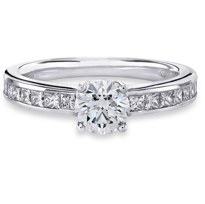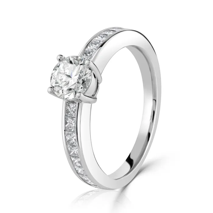 An elegant platinum ring, a beacon of luxury and sophistication. At the centre of this stunning piece, a four-claw set round brilliant cut diamond shines prominently, weighing 0.76ct, its sparkle symbolizing a beacon of light and love. Enhancing its majestic presence, the ring's shoulders are channel set with eighteen princess cut diamonds, nine on each side, adding an additional layer of brilliance with a combined weight of 0.60ct.