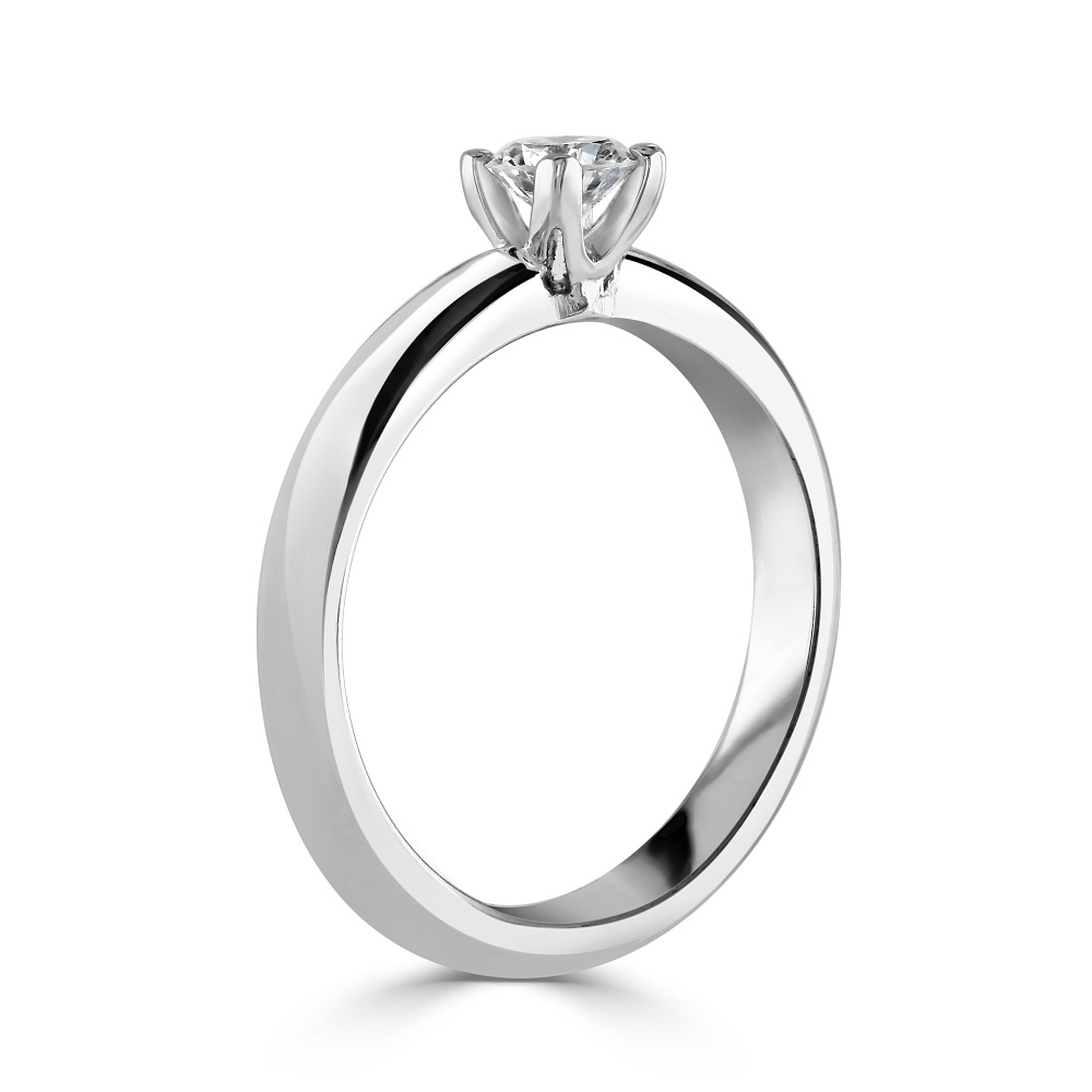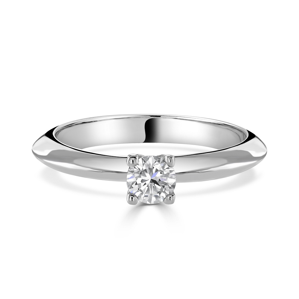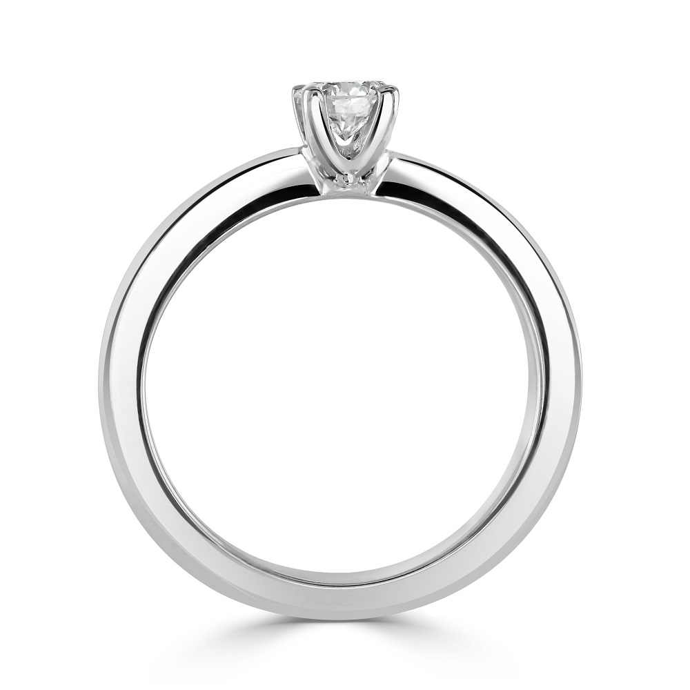 An exquisite platinum single stone knife edge ring, a true masterpiece of craftsmanship and elegance. This luxurious ring features a stunning round brilliant cut diamond, meticulously set in a four-claw arrangement to maximize its brilliance and sparkle. The diamond weighs 0.30 carats, striking the perfect balance between subtlety and statement.