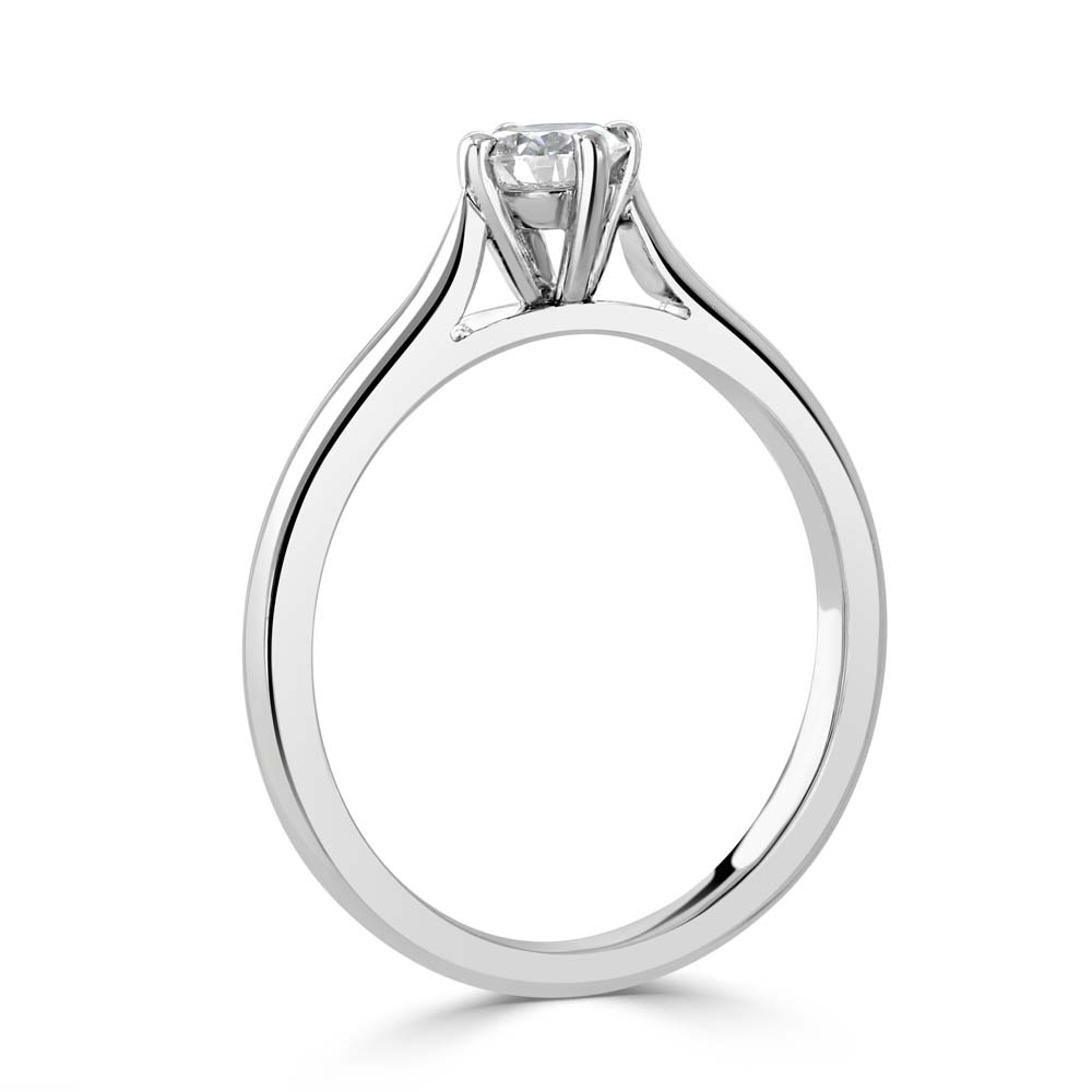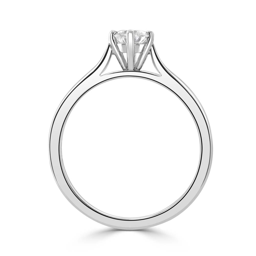 Unveil the pure elegance of our platinum solitaire ring, showcasing a unique and sophisticated design. This exquisite piece features a GIA-certified round brilliant cut diamond, weighing 0.30 carats, securely held in a distinctive four-claw compass setting that not only enhances the diamond’s visibility but also its breathtaking sparkle. Graded D in colour and SI1 in clarity, the diamond offers exceptional brilliance and a flawless appearance. Crafted from premium platinum, known for its durability and sleek finish, this ring is designed to stand the test of time. Perfect for engagements, anniversaries, or as a special gift, this solitaire ring embodies timeless beauty and refined luxury, making it an ideal choice for those seeking a standout piece to cherish forever.