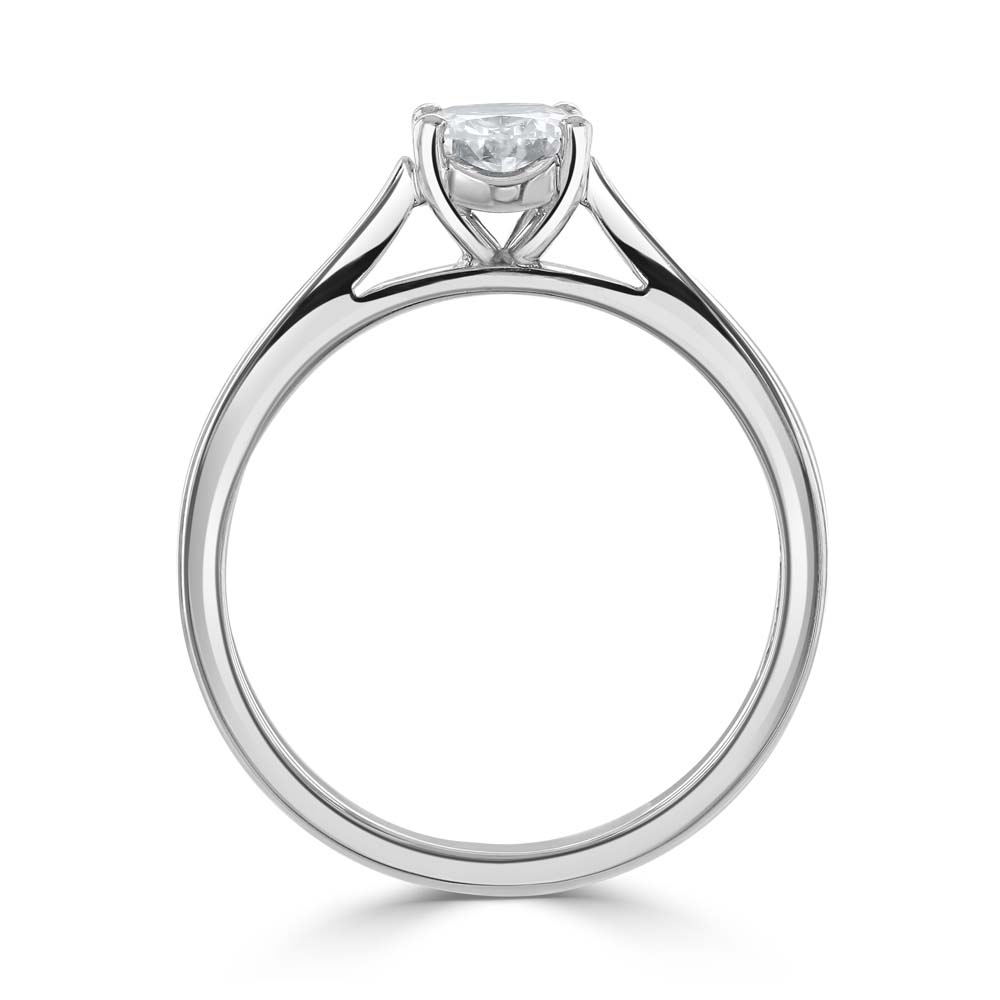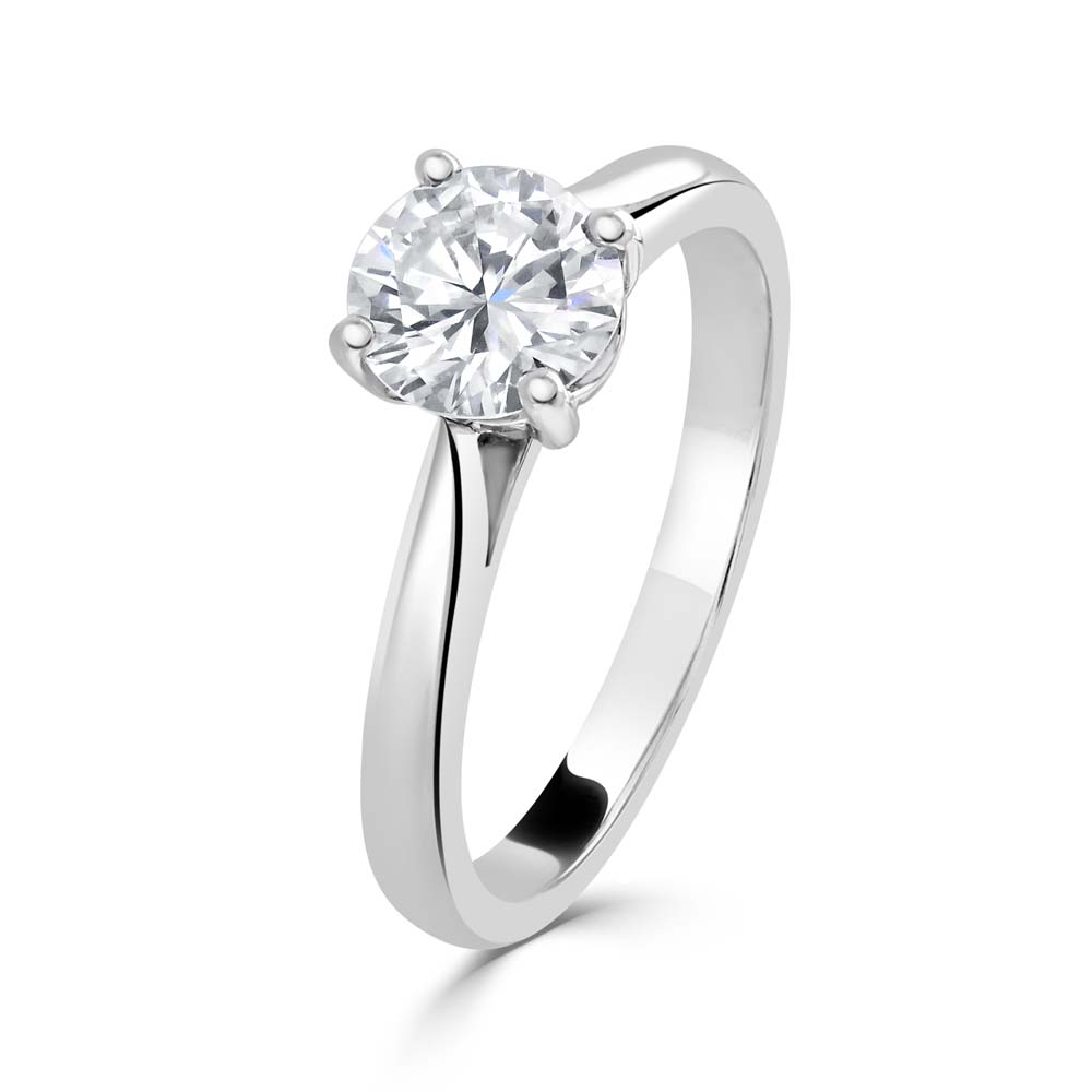 A timeless platinum solitaire ring, featuring a resplendent round brilliant cut diamond, weighing a perfect 1.00ct. This exquisite diamond is securely embraced by four scalloped claws, adding a touch of elegance, and ensuring the stone's brilliance is the centrepiece of admiration. The diamond's exceptional quality is affirmed by its GIA certification, boasting an E colour and SI1 clarity, symbolizing both purity and sparkle. The ring's design is complemented by a gracefully tapered shank, which enhances the diamond's visual impact and ensures a comfortable fit. Crafted from premium platinum, known for its strength and durability, this solitaire ring is not just a piece of jewellery but a symbol of timeless beauty and enduring love.