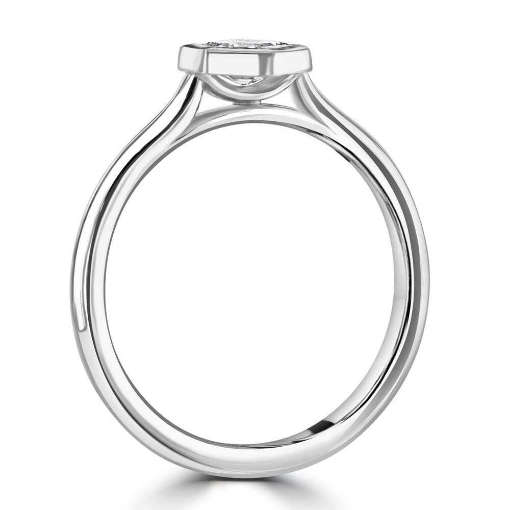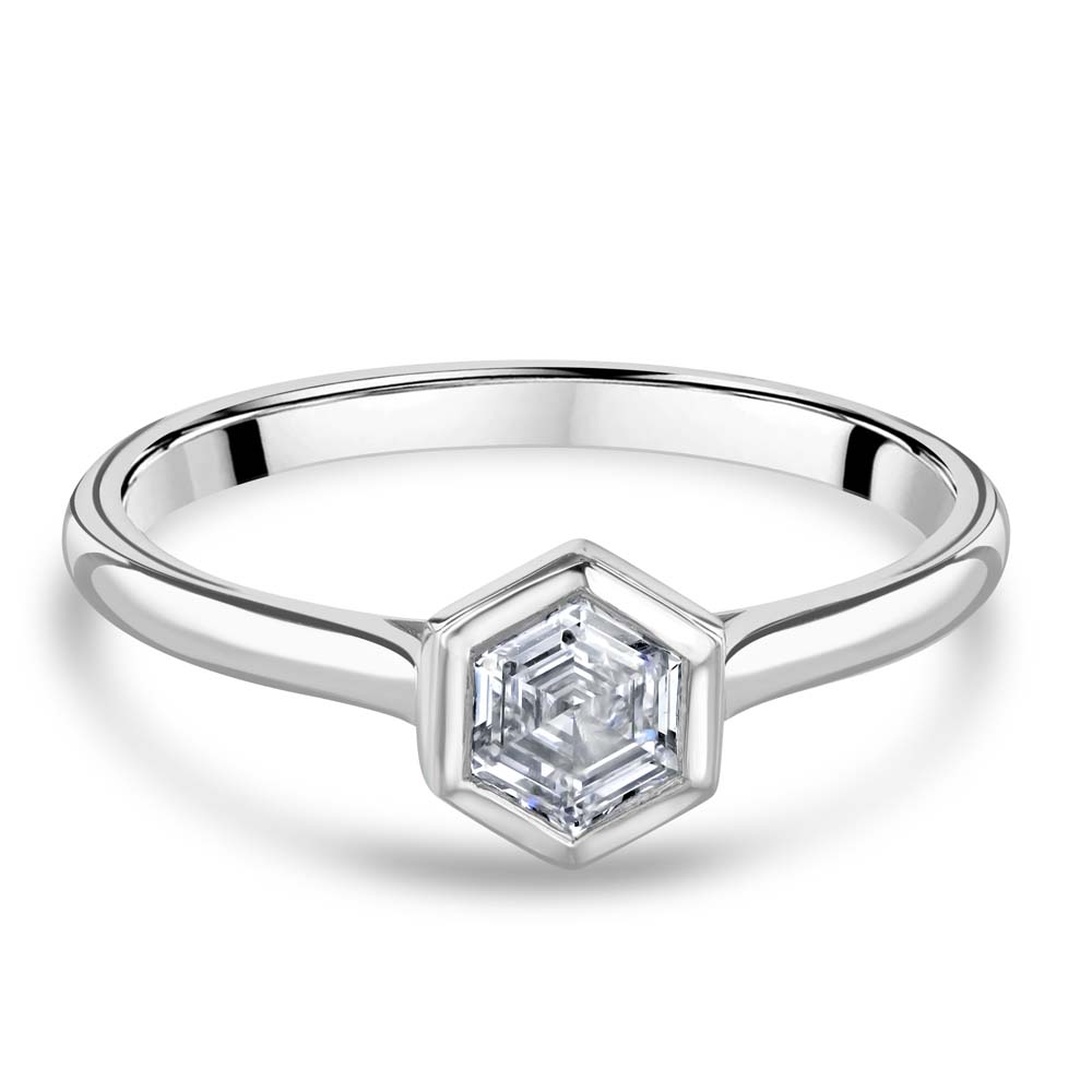 Distinctive and modern, this platinum solitaire ring features a striking hexagon-cut diamond, securely rubover set to showcase its unique geometry and brilliance. The clean lines of the hexagonal shape offer a contemporary twist on classic solitaire styling, while the rubover setting provides a sleek, smooth finish that enhances both comfort and durability. Graded D colour and VS2 clarity, the 0.40ct diamond radiates exceptional purity and sparkle, perfectly complemented by the cool elegance of platinum. A refined statement of individuality and sophistication, this ring is ideal as a modern engagement piece or a standout addition to any fine jewellery collection.