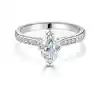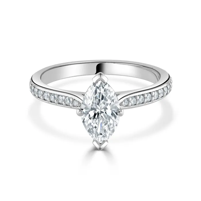 An elegant platinum diamond ring, a testament to luxury and sophisticated design. This exquisite piece features a stunning GIA-certified marquise shaped diamond, weighing 1.00ct, meticulously set to capture and reflect light from every angle. The diamond's unique marquise cut not only enhances its brilliance but also showcases its clarity and beauty, making it a focal point of this elegant ring.
