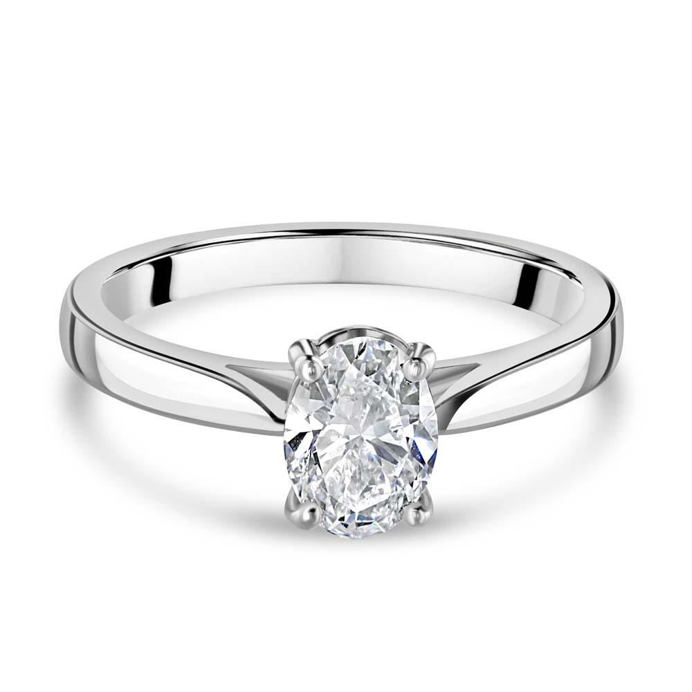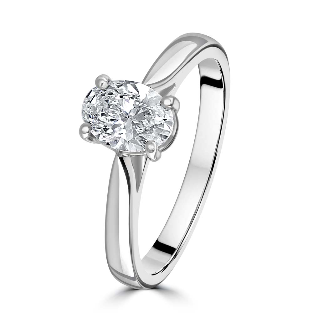 Embrace timeless sophistication with our platinum solitaire ring, featuring a dazzling oval cut diamond set in a classic 4-claw setting. This elegant ring is designed with tapered shoulders, drawing attention to the stunning centre diamond and enhancing its brilliance. The centrepiece of this exquisite ring is a GIA-certified oval cut diamond, weighing an impressive 0.80 carats. With an exceptional E colour grade, the diamond offers a near-colourless radiance that captivates the eye. The VS1 clarity grade ensures a pristine sparkle, with inclusions that are only visible under high magnification, allowing the diamond's true beauty to shine through. Crafted from premium platinum, this solitaire ring combines luxurious aesthetics with lasting durability. The tapered shoulders of the band elegantly accentuate the centre diamond, creating a harmonious and balanced design. Perfect for engagements, anniversaries, or any special occasion, this platinum solitaire ring is a symbol of refined elegance and everlasting love.