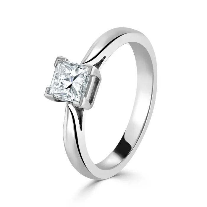 Presenting our platinum diamond solitaire ring, a masterpiece of refined elegance designed to captivate and charm. This exquisite ring features a single 0.70ct princess cut diamond, expertly secured in a unique corner claw setting that enhances its geometric beauty and brilliant sparkle. The sleek platinum band tapers gracefully towards the diamond, emphasizing its stunning clarity and precision cut. Crafted from premium platinum, this ring is the epitome of luxury and durability, making it an ideal choice for engagements, special anniversaries, or as a treasured addition to any fine jewellery collection. Embrace this symbol of timeless love and sophistication, perfectly designed to be cherished for generations.