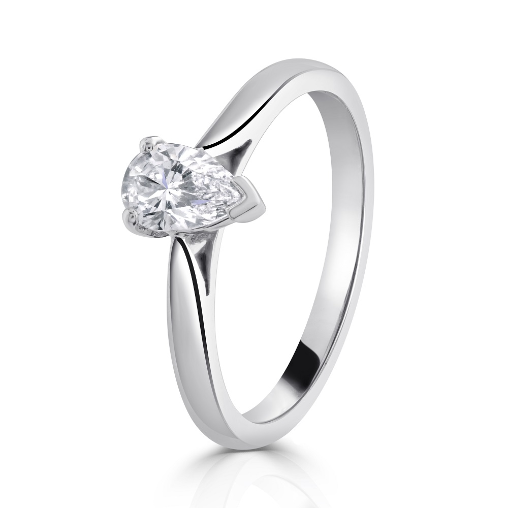 Our elegant platinum solitaire ring, showcasing a stunning pear cut diamond. This exquisite diamond, weighing 0.50 carats and certified with an E colour and SI1 clarity, is securely held in a unique three-claw setting that accentuates its sleek, elongated shape and brilliant sparkle. The ring's band is skilfully tapered, enhancing the overall sleek design and focusing attention on the luminous centrepiece. Crafted from high-quality platinum, this ring offers a durable and timeless look, making it perfect for engagements, special celebrations, or as an extraordinary gift. Embrace this symbol of luxury and timeless beauty, designed to be a cherished addition to any fine jewellery collection.