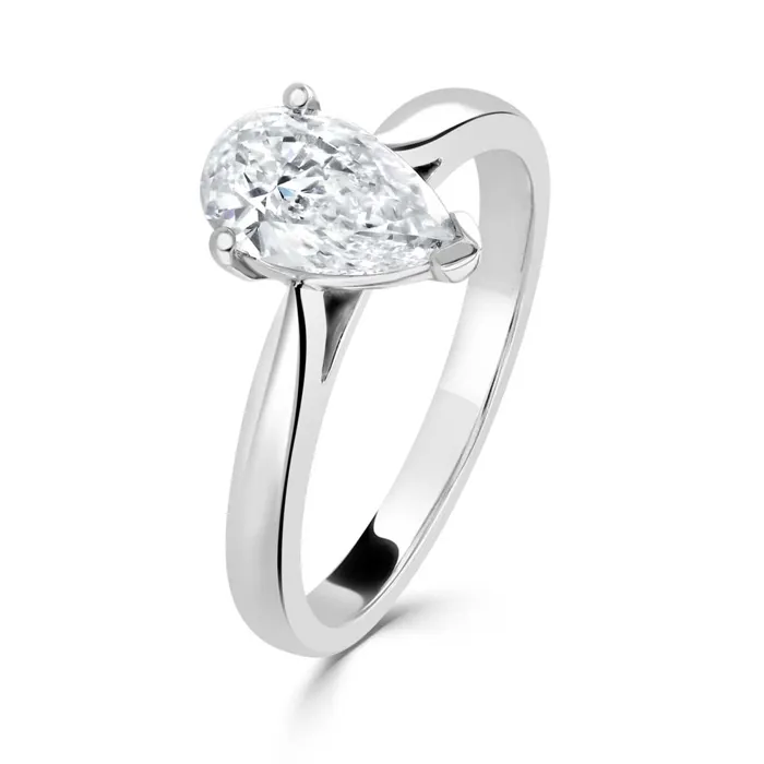 A platinum solitaire ring, a hallmark of sophistication and timeless elegance, showcasing a stunning 1.01ct pear cut diamond, exquisitely held in place by a three-claw setting. This unique design emphasizes the diamond's natural beauty and brilliance, making it a standout piece. The ring features a gracefully tapered shank, further enhancing its sleek and refined silhouette. The featured pear cut diamond is of exceptional quality, with a G colour and SI1 clarity, ensuring a dazzling display of sparkle and clarity. This Platinum Solitaire Ring is not just a piece of jewellery but a symbol of enduring love and luxury, perfect for those who appreciate the beauty of simplicity with a touch of grandeur.