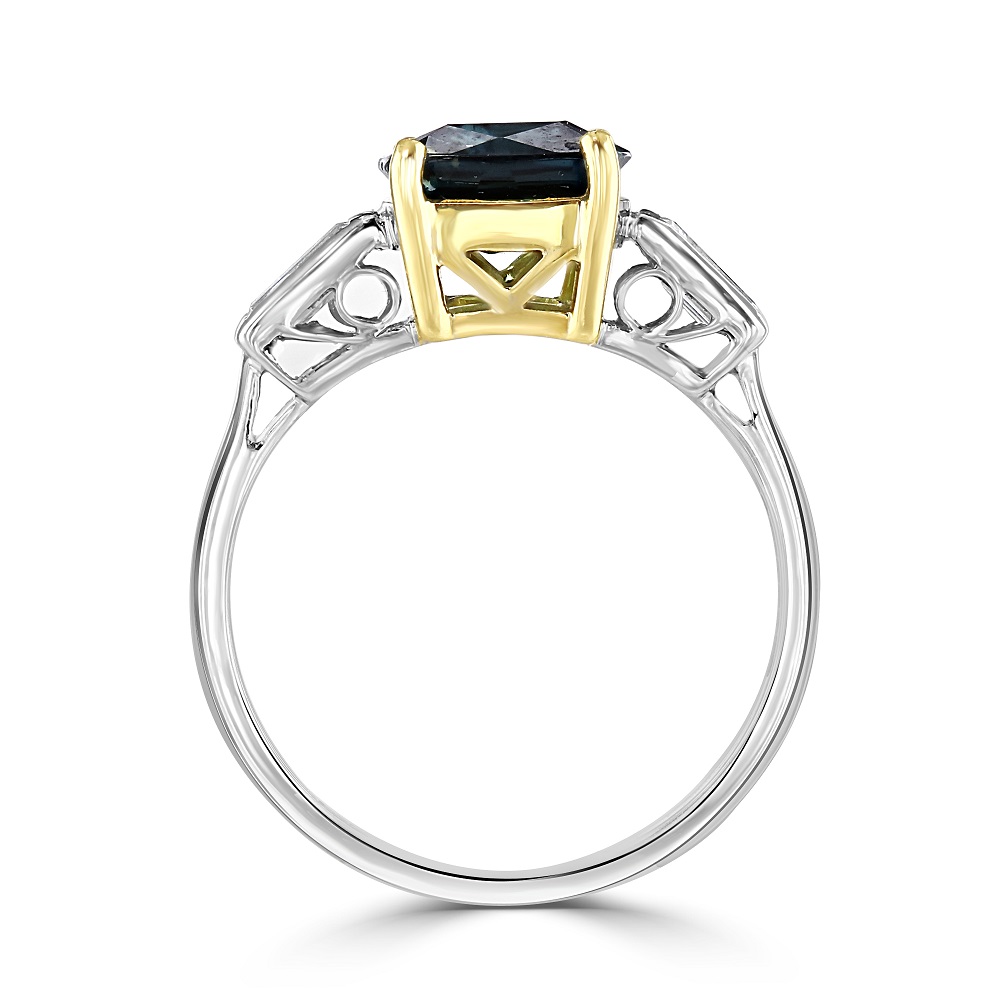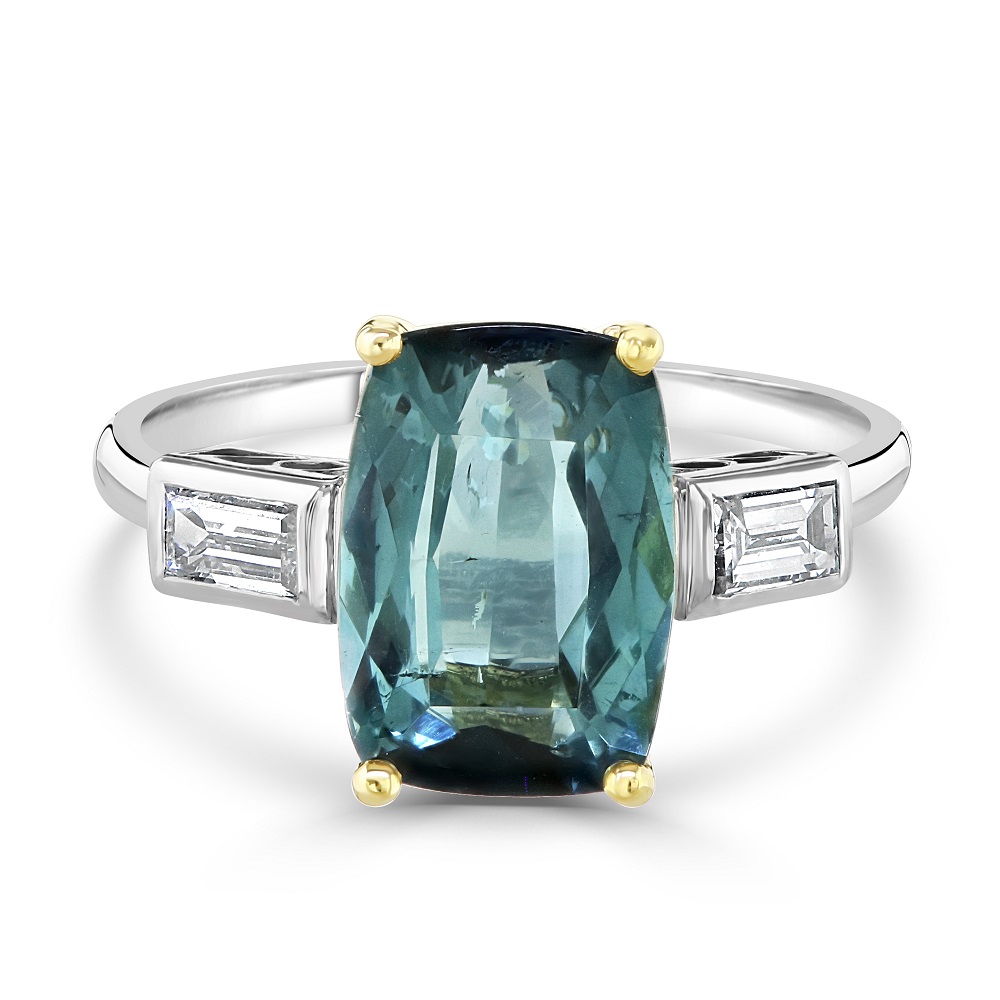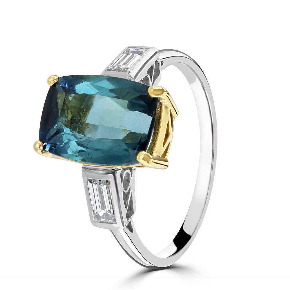 Discover the striking beauty of our platinum and 18ct yellow gold trilogy ring, a magnificent piece that marries vibrant colour with classic design. At the heart of this exquisite ring is a 3.42ct cushion cut teal tourmaline, securely held by four claws, showcasing its deep, captivating hue. Flanking this stunning gemstone are two rubover set baguette cut diamonds, contributing an additional 0.40 carats of sparkle. The unique combination of the rich teal tourmaline and the clarity of the diamonds makes this ring a standout piece. Crafted with a blend of platinum and 18ct yellow gold, this ring offers a luxurious, two-tone aesthetic that enhances the overall elegance of the design. Perfect for special occasions, engagements, or as an opulent gift, this trilogy ring is a timeless investment for those who appreciate exquisite craftsmanship and unique gemstone jewellery.