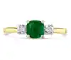 An exquisite platinum and 18ct yellow gold trilogy ring, a symbol of elegance and timeless beauty. This luxurious piece features a captivating 0.63ct cushion-cut emerald at its heart, securely held in place by four sophisticated claws, showcasing its deep green hue and natural brilliance. Flanking the emerald, you'll find two round brilliant-cut diamonds, with a combined weight of 0.21ct, each set in delicate claws that enhance their natural sparkle. These diamonds ensure a dazzling display of light and luxury.