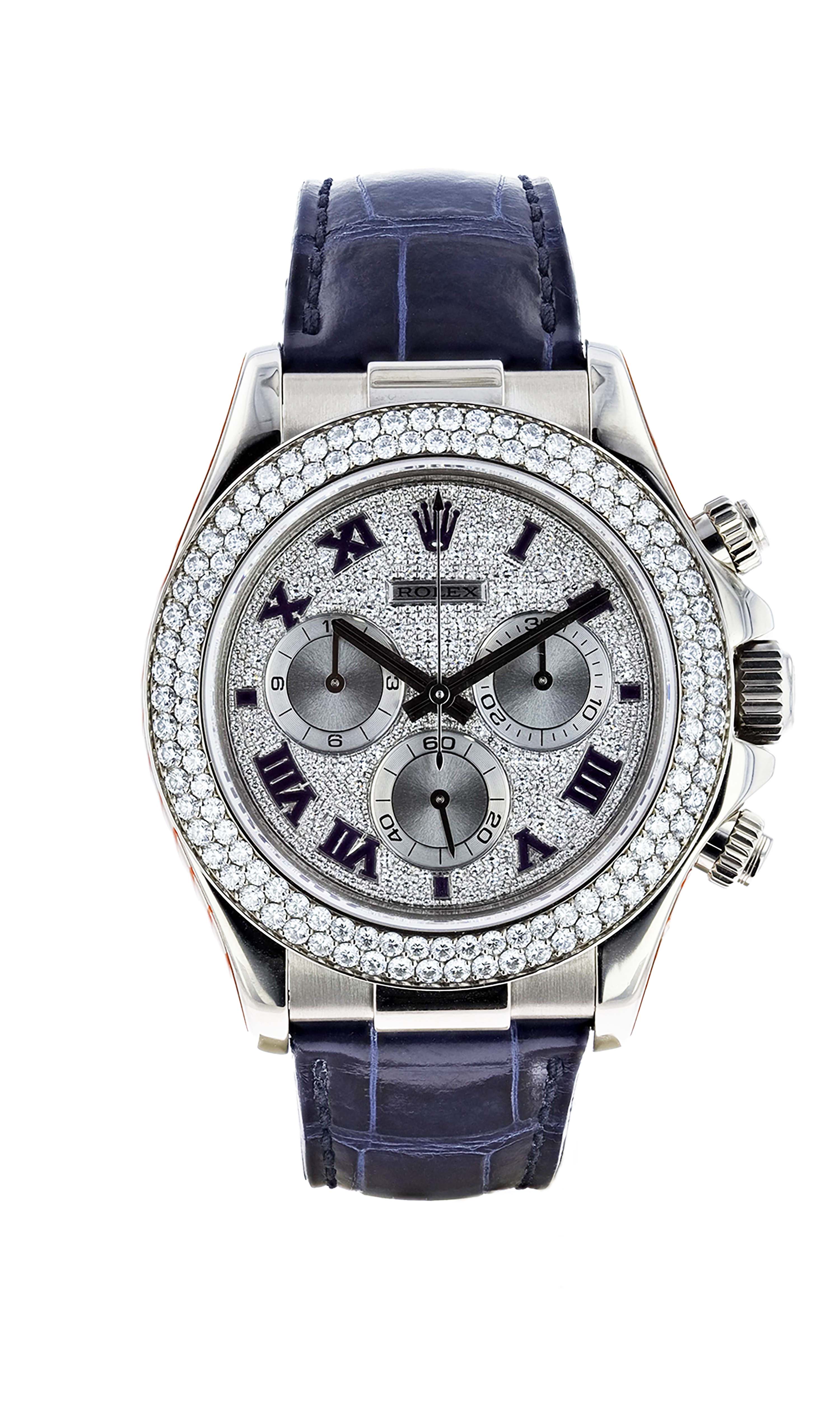 Pre-owned 18ct white gold Rolex Oyster Perpetual Cosmograph Daytona Chronometer watch wth a pavé diamond and blue roman numeral dial and diamond set bezel on a blue crocodile strap. Model: 116589RB. PLEASE NOTE: Interest Free Credit is not available for this model.