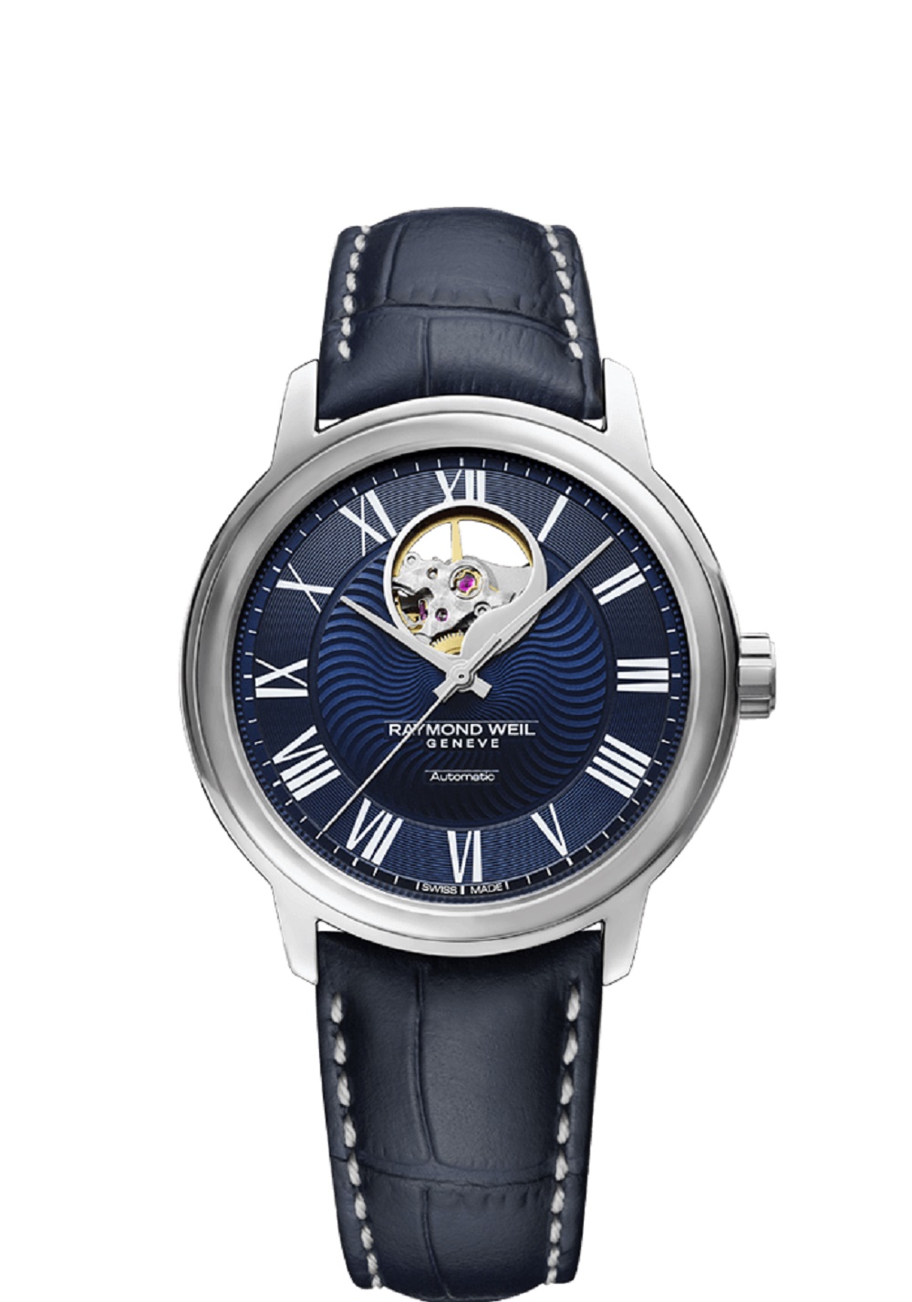 RAYMOND WEIL présents the maestro Blues, inspired by the bewitching sounds of the “blues”. Equipped with a mechanical automatic winding movement housed in a 40mm-diameter case, this timepiece feature a captivating dark blue dial, endowed with a delicate wave-like decoration.