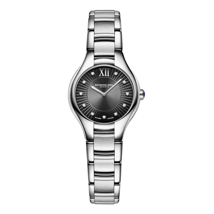 The noemia 5124-ST-60181 model features a grey roman numeral dial, decorated with diamond dot indexes that add wow factor to the timepiece. The round, hand polished 24mm polished stainless steel case houses a quartz movement – the most precise watch keeping movement ever created. This timepiece combines elegance, style, an abundance of class and demonstrates RAYMOND WEIL’s passion for family. The noemia collection has been designed to convey precision timekeeping whilst adopting a very contemporary design, maximized through the use of diamond embellishments on the colourful galvanic dials.