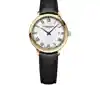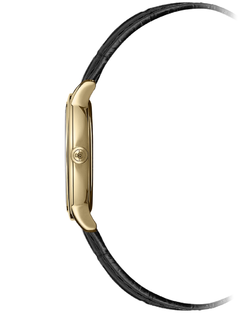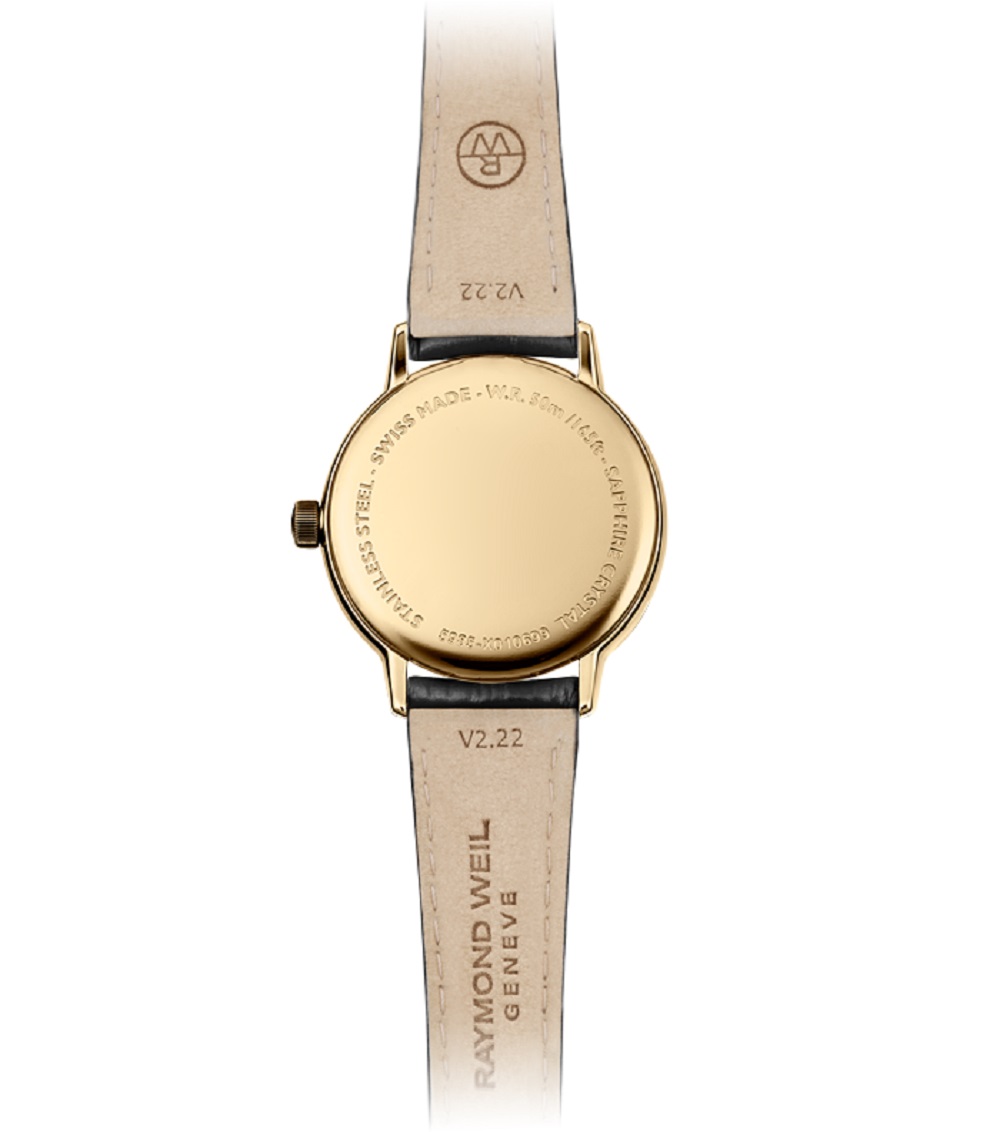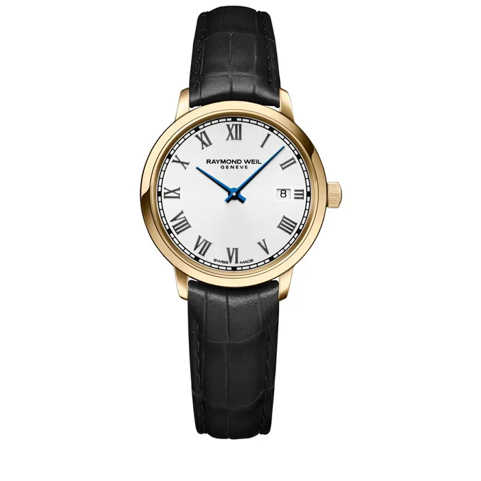 Equipped with a quartz movement, this toccata ladies’ watch features a stainless steel 29 mm case with yellow gold PVD plating and a date window at 3 o’clock. The white lacquered dial is set with applied Roman numeral indexes and has a railway-track chapter ring that aids readability. To complement this modern classic, alligator motifs have been added on the strap. Refined design and timeless materials: the toccata collection celebrates the artistic and musical spirit behind the Brand’s DNA. Following in the footsteps of the great composers, toccata timepieces promote the Swiss horology of RAYMOND WEIL while respecting the tradition and heritage handed down from generation to generation within the family company.