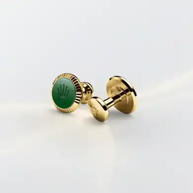 Rolex cufflinks made of 18 ct yellow gold featuring the signature Rolex fluting, Cerachrom insert and Rolex crown.