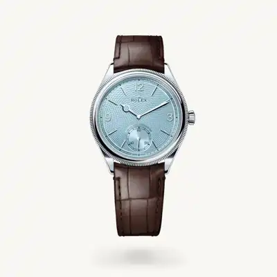 The ice blue dial features a guilloché rice-grain motif. This rosette-like design is distinctive for its three-dimensional, repeating geometric pattern that extends across the surface of the dial starting from the small seconds counter at 6 o’clock. The minute track is surrounded by a filet sauté with crimped pattern, which is also guilloché. With the introduction of a dial created via guillochage, or engine turning – a technique that uses a turning tool to sculpt a pattern into a surface – Rolex is pursuing the course it has set for the Perpetual collection as a tribute to the classic art of watchmaking infused with the brand’s know-how and creativity. This exclusive dial bears the same Arabic numerals 3, 9 and 12, the same faceted hour markers and the same hands as that of the 18 ct gold versions. This exclusive dial colour can be found only on the Day-Date, the Cosmograph Daytona and the Perpetual 1908.