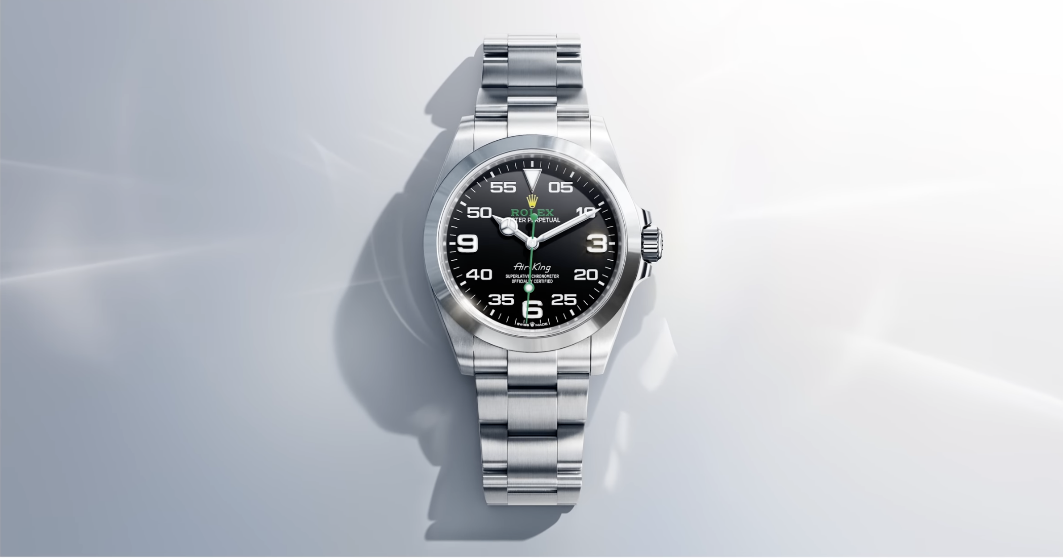 Like all Rolex watches, the Air-King is covered by the Superlative Chronometer certification. This designation testifies that every watch leaving the brand’s workshops has successfully undergone a series of tests conducted by Rolex in its own laboratories, according to its own criteria. The Superlative Chronometer status is symbolised by the green seal that comes with every Rolex watch and is coupled with an international five-year guarantee.