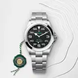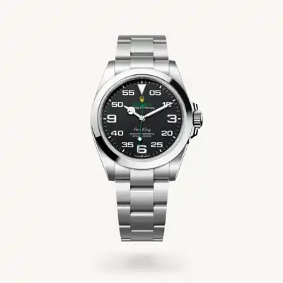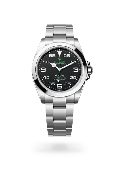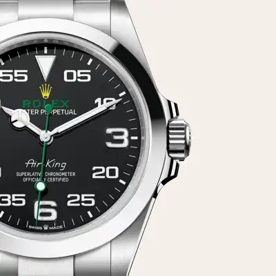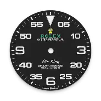 The Air-King dial features a distinctive black dial with a combination of large 3, 6 and 9 numerals marking the hours and a prominent minute scale for navigational time readings. It bears the name Air-King in the same lettering that was designed specially for the model in the 1950s.