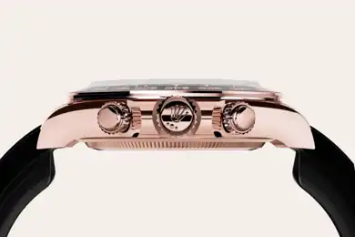 The 18 ct gold versions of the Cosmograph Daytona with a Cerachrom bezel are available with an Oysterflex bracelet. Developed by Rolex and patented, it singularly combines the robustness of a metal bracelet with the comfort of an elastomer bracelet. It is made up of two flexible curved metal blades – one in each bracelet section – overmoulded with high-performance black elastomer. For optimum comfort, the Oysterflex bracelet is equipped with cushions on its inner sides and an Oysterlock safety clasp to prevent accidental opening. Its length may be adjusted via the ingenious Rolex Glidelock extension system.