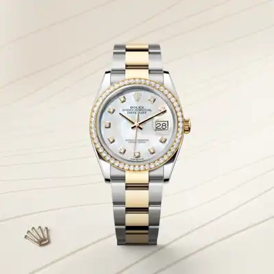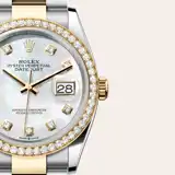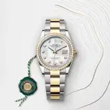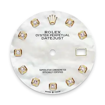 This dial features diamonds in 18 ct gold settings. Mother-of-pearl is by its nature full of mystery and surprises. Depending on its origin, it can be pink, white, black or yellow. It differs in colour, intensity and structure according to the part of the shell from which it is extracted. At Rolex, mother-of-pearl is never artificially coloured. Instead, particular know-how and skill are devoted to simply highlighting its natural beauty and preserving the original hues. As all mother-of-pearl dials are unique pieces, an identical dial will never be found on another wrist.