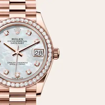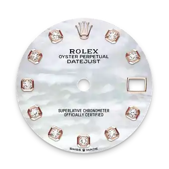 This dial features diamonds in 18 ct gold settings. Mother-of-pearl is by its nature full of mystery and surprises. Depending on its origin, it can be pink, white, black or yellow. It differs in colour, intensity and structure according to the part of the shell from which it is extracted. At Rolex, mother-of-pearl is never artificially coloured. Instead, particular know-how and skill are devoted to simply highlighting its natural beauty and preserving the original hues. As all mother-of-pearl dials are unique pieces, an identical dial will never be found on another wrist.