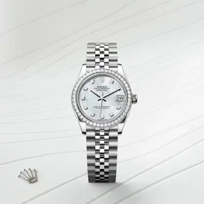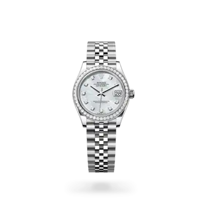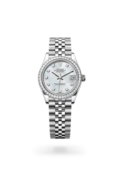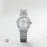 This dial features diamonds in 18 ct gold settings. Mother-of-pearl is by its nature full of mystery and surprises. Depending on its origin, it can be pink, white, black or yellow. It differs in colour, intensity and structure according to the part of the shell from which it is extracted. At Rolex, mother-of-pearl is never artificially coloured. Instead, particular know-how and skill are devoted to simply highlighting its natural beauty and preserving the original hues. As all mother-of-pearl dials are unique pieces, an identical dial will never be found on another wrist.