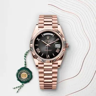 The version presented, in 18 ct Everose gold, introduces slate ombré dial – a completely new hue for such a dial, whose surface, coloured at the centre, progresses to a deep black around the edge. Also appearing for the first time on the ombré dial of this watch are faceted, deconstructed Roman numerals and faceted index hour markers in 18 ct pink gold. Until now, Rolex ombré dials were set with diamond hour markers and were reserved for the Day-Date 36. This dial represents the continuity of a design that Rolex introduced in the 1980s and relaunched in 2019. The manufacture of these dials with a concentric gradient involves the application of black lacquer, a delicate operation overseen by a specialist whose task it is to ensure the harmonious transition from colour to darkness.