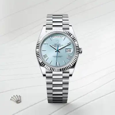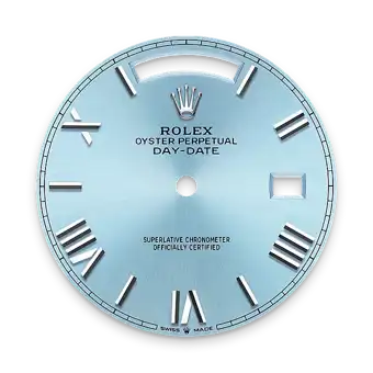 The ice-blue dial is the discreet and exclusive signature of a Rolex platinum watch. Rolex uses platinum, the noblest of metals, for the finest of watches. This exclusive dial colour can be found only on the Day-Date, the Cosmograph Daytona, the Perpetual 1908 and the Land-Dweller.
