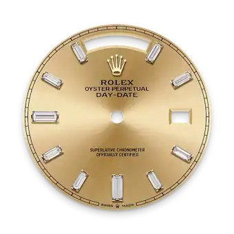 This dial features 10 baguette-cut diamonds. The sunray finish creates delicate light reflections on many dials in the Oyster Perpetual collection. It is obtained using masterful brushing techniques that create grooves running outwards from the centre of the dial. Light is diffused consistently along each engraving, creating a characteristic subtle glow that moves depending on the position of the wrist. Once the sunray finish has been completed, the dial colour is applied using Physical Vapour Deposition or electroplating. A light coat of varnish gives the dial its final look.