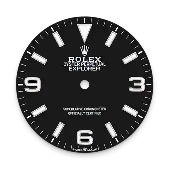 The dial is the distinctive face of a Rolex watch, the feature most responsible for its identity and readability. The Explorer model’s characteristic 3, 6 and 9 numerals are filled with a luminescent material emitting a long-lasting blue glow, like the hour markers and hands. Like all Rolex timepieces, the Explorer 40's dial is designed and manufactured in-house, largely by hand to ensure perfection.