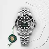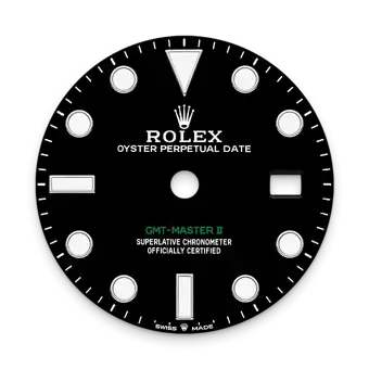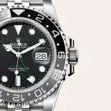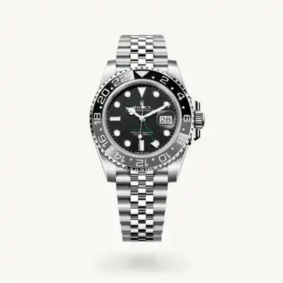This model features a black dial and a two-colour Cerachrom bezel insert in grey and black ceramic. In addition to conventional hour, minute and seconds hands, the GMT-Master II features an arrow-tipped hand, which circles the dial once every 24 hours, as well as a bidirectional rotatable 24-hour graduated bezel. The distinctively coloured 24-hour hand displays the “home” reference time in a first time zone which can be read on the graduations on the bezel. The traveller’s local time is easily set by “jumping” from hour to hour, thanks to an ingenious mechanism operated via the winding crown: the hour hand can be adjusted forwards or backwards independently of the minute and seconds hands. This allows travellers to adapt to their new time zone without affecting the precision of their timekeeping.