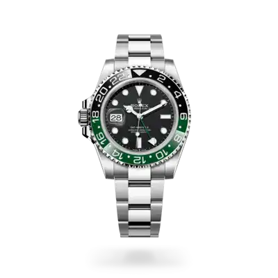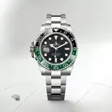 This model features a black dial and a two-colour Cerachrom bezel insert in green and black ceramic. In addition to conventional hour, minute and seconds hands, the GMT-Master II features an arrow-tipped hand, which circles the dial once every 24 hours, as well as a bidirectional rotatable 24-hour graduated bezel. The distinctively coloured 24-hour hand displays the “home” reference time in a first time zone which can be read on the graduations on the bezel. The traveller’s local time is easily set by “jumping” from hour to hour, thanks to an ingenious mechanism operated via the winding crown: the hour hand can be adjusted forwards or backwards independently of the minute and seconds hands. This allows travellers to adapt to their new time zone without affecting the precision of their timekeeping. The Cerachrom bezel insert features an original colour combination: black and an exclusive green that is reserved for this model.