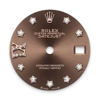 This dial features diamonds in 18 ct gold settings and a Roman IX in 18 ct gold, set with 8 diamonds. The sunray finish creates delicate light reflections on many dials in the Oyster Perpetual collection. It is obtained using masterful brushing techniques that create grooves running outwards from the centre of the dial. Light is diffused consistently along each engraving, creating a characteristic subtle glow that moves depending on the position of the wrist. Once the sunray finish has been completed, the dial colour is applied using Physical Vapour Deposition or electroplating. A light coat of varnish gives the dial its final look.