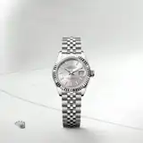 The Rolex fluted bezel is a mark of distinction. Originally, the fluting of the Oyster bezel had a functional purpose: it served to screw the bezel onto the case helping to ensure the waterproofness of the watch. It was therefore identical to the fluting on the case back, which was also screwed onto the case for waterproofness, using specific Rolex tools. Over time, the fluting became an aesthetic element, a genuine Rolex signature feature. Today the fluted bezel is a mark of distinction, in gold on this Lady-Datejust.