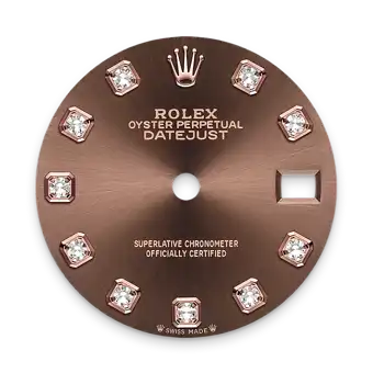 This dial features diamonds in 18 ct gold settings. The sunray finish creates delicate light reflections on many dials in the Oyster Perpetual collection. It is obtained using masterful brushing techniques that create grooves running outwards from the centre of the dial. Light is diffused consistently along each engraving, creating a characteristic subtle glow that moves depending on the position of the wrist. Once the sunray finish has been completed, the dial colour is applied using Physical Vapour Deposition or electroplating. A light coat of varnish gives the dial its final look.