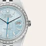 This ice blue – a colour reserved for watches made of platinum – dial is adorned with a honeycomb motif with a sunray finish. Its creation calls on traditional craftsmanship and high-technology methods, all mastered in-house. The honeycomb structure is cut with a femtosecond laser, which is also used to etch the delicate lines in the grooves separating each cell. The dial is set with 10 baguette-cut diamonds to mark the hours.