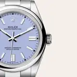 The colours created for the Oyster Perpetual range start life as a lacquer, which must be meticulously applied in a controlled-atmosphere environment to avoid dust and other contamination. The brass plate of the dial base receives layer upon layer of lacquer, six in all, to form a regular, uniform surface. The last step is varnishing and polishing to bring out the full brilliance and depth of colour. The various inscriptions are then pad printed, and the hour markers and crown riveted by hand. The dial, gleaming in its perfection, is all set to take its place on top of the movement at the watch assembly phase.
