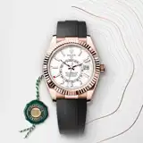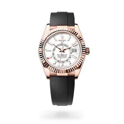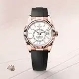 The Sky-Dweller’s new Oysterflex bracelet, developed by Rolex and patented, offers a sporty alternative to metal bracelets. The bracelet attaches to the watch case and the Oysterclasp by a flexible titanium and nickel alloy metal blade. The blade is overmoulded with high-performance black elastomer which is particularly resistant to environmental effects, very durable and perfectly inert for the wearer of the watch. For enhanced comfort, the inside of the Oysterflex bracelet is equipped with a patented longitudinal cushion system that stabilizes the watch on the wrist and fitted with an 18 ct Everose gold Oysterclasp. It also features the Rolex Glidelock extension system, designed by the brand and patented. This inventive toothed mechanism, integrated beneath the clasp, allows fine adjustment of the bracelet length by some 15 mm in increments of approximately 2.5 mm, without the use of tools.