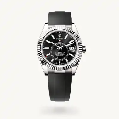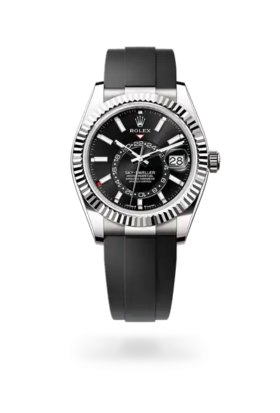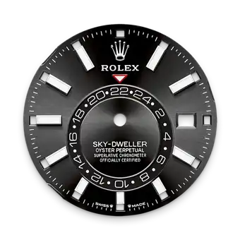 The Sky-Dweller’s new Oysterflex bracelet, developed by Rolex and patented, offers a sporty alternative to metal bracelets. The bracelet attaches to the watch case and the Oysterclasp by a flexible titanium and nickel alloy metal blade. The blade is overmoulded with high-performance black elastomer which is particularly resistant to environmental effects, very durable and perfectly inert for the wearer of the watch. For enhanced comfort, the inside of the Oysterflex bracelet is equipped with a patented longitudinal cushion system that stabilizes the watch on the wrist and fitted with an 18 ct white gold Oysterclasp. It also features the Rolex Glidelock extension system, designed by the brand and patented. This inventive toothed mechanism, integrated beneath the clasp, allows fine adjustment of the bracelet length by some 15 mm in increments of approximately 2.5 mm, without the use of tools.