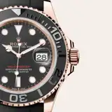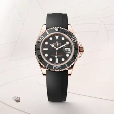 The Yacht-Master’s new Oysterflex bracelet, developed by Rolex and patented, offers a sporty alternative to metal bracelets. The bracelet attaches to the watch case and the Oysterlock safety clasp by a flexible titanium and nickel alloy metal blade. The blade is overmoulded with high-performance black elastomer which is particularly resistant to environmental effects, very durable and perfectly inert for the wearer of the watch. For enhanced comfort, the inside of the Oysterflex bracelet is equipped with a patented longitudinal cushion system that stabilizes the watch on the wrist and fitted with an 18 ct Everose gold Oysterlock safety clasp. It also features the Rolex Glidelock extension system, designed by the brand and patented. This inventive toothed mechanism, integrated beneath the clasp, allows fine adjustment of the bracelet length by some 15 mm in increments of approximately 2.5 mm, without the use of tools.