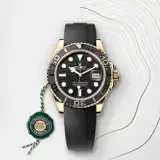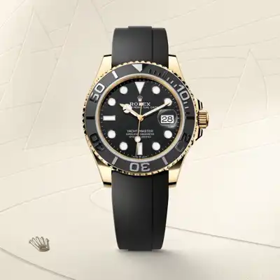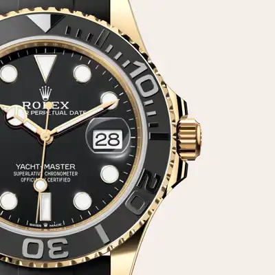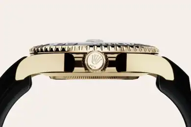 The Yacht-Master’s new Oysterflex bracelet, developed by Rolex and patented, offers a sporty alternative to metal bracelets. The bracelet attaches to the watch case and the Oysterlock safety clasp by a flexible titanium and nickel alloy metal blade. The blade is overmoulded with high-performance black elastomer which is particularly resistant to environmental effects, very durable and perfectly inert for the wearer of the watch. For enhanced comfort, the inside of the Oysterflex bracelet is equipped with a patented longitudinal cushion system that stabilizes the watch on the wrist and fitted with an 18 ct yellow gold Oysterlock safety clasp. It also features the Rolex Glidelock extension system, designed by the brand and patented. This inventive toothed mechanism, integrated beneath the clasp, allows fine adjustment of the bracelet length by some 15 mm in increments of approximately 2.5 mm, without the use of tools.