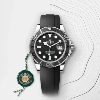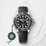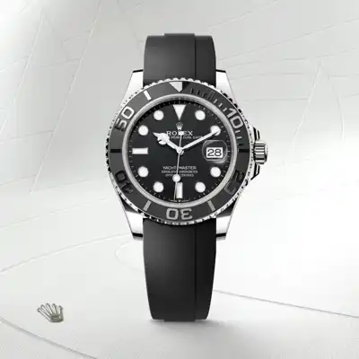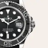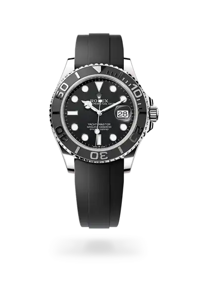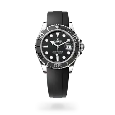 The Yacht-Master’s new Oysterflex bracelet, developed by Rolex and patented, offers a sporty alternative to metal bracelets. The bracelet attaches to the watch case and the Oysterlock safety clasp by a flexible titanium and nickel alloy metal blade. The blade is overmoulded with high-performance black elastomer which is particularly resistant to environmental effects, very durable and perfectly inert for the wearer of the watch. For enhanced comfort, the inside of the Oysterflex bracelet is equipped with a patented longitudinal cushion system that stabilizes the watch on the wrist and fitted with an 18 ct white gold Oysterlock safety clasp. It also features the Rolex Glidelock extension system, designed by the brand and patented. This inventive toothed mechanism, integrated beneath the clasp, allows fine adjustment of the bracelet length by some 15 mm in increments of approximately 2.5 mm, without the use of tools.