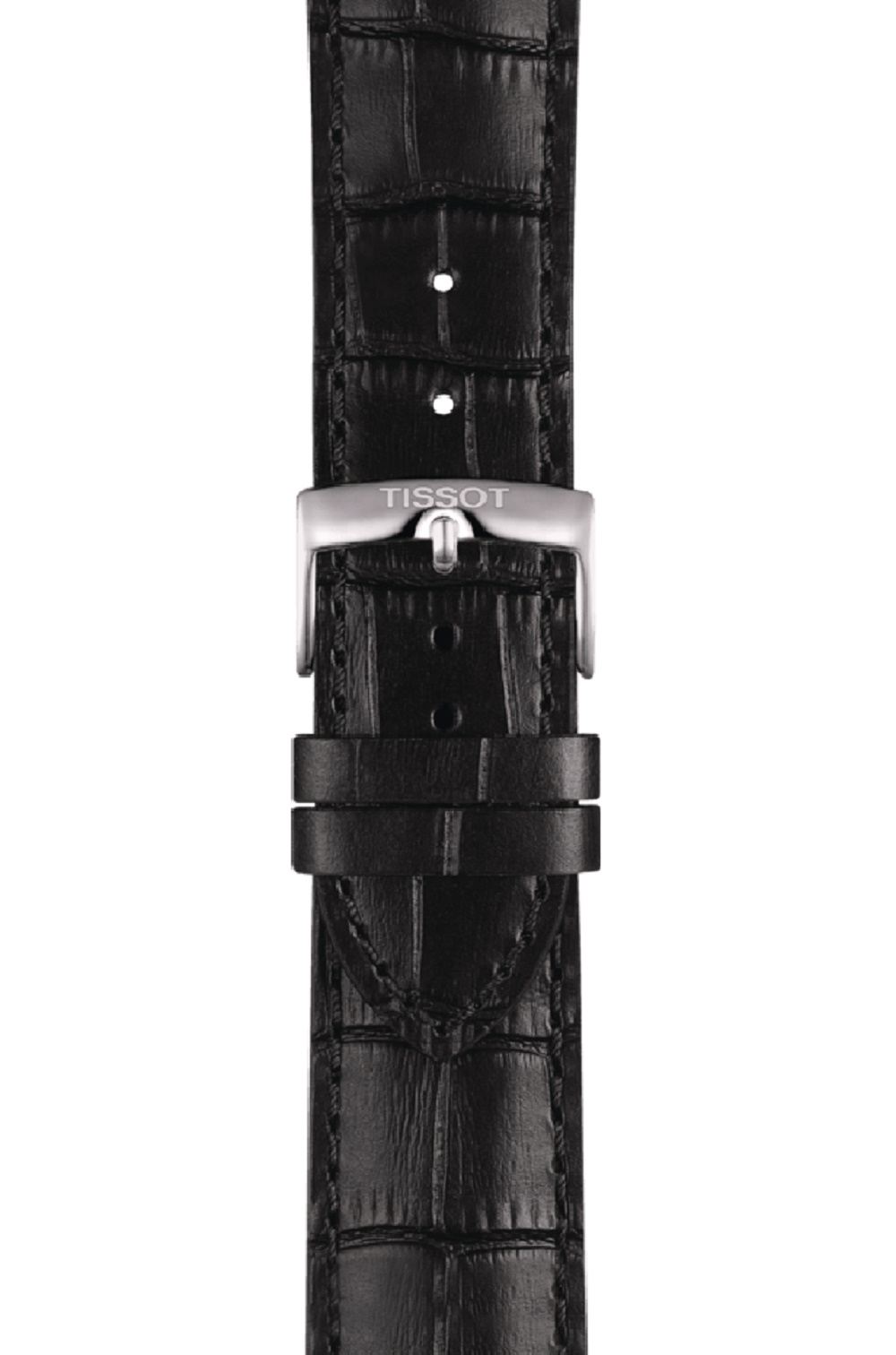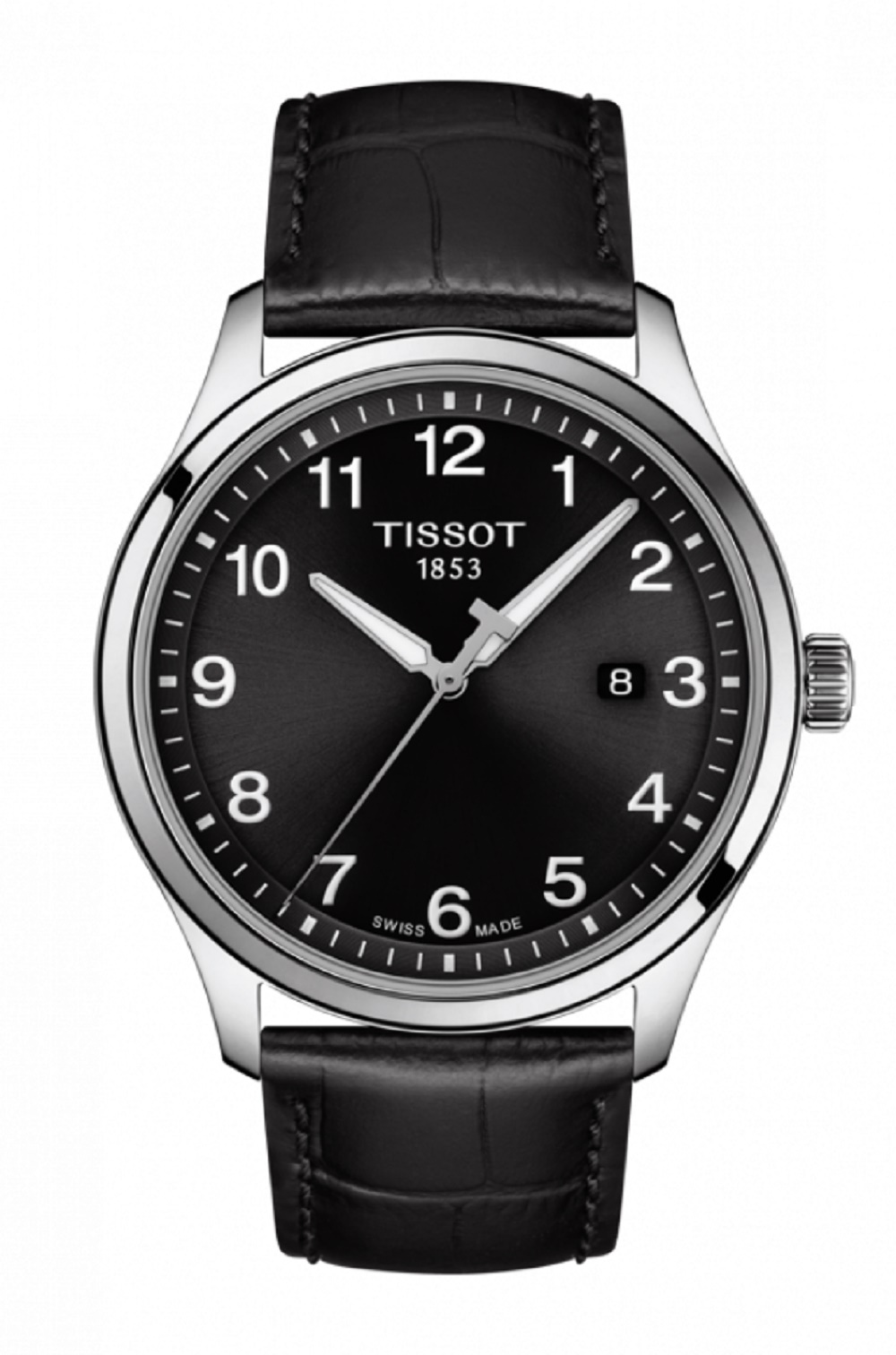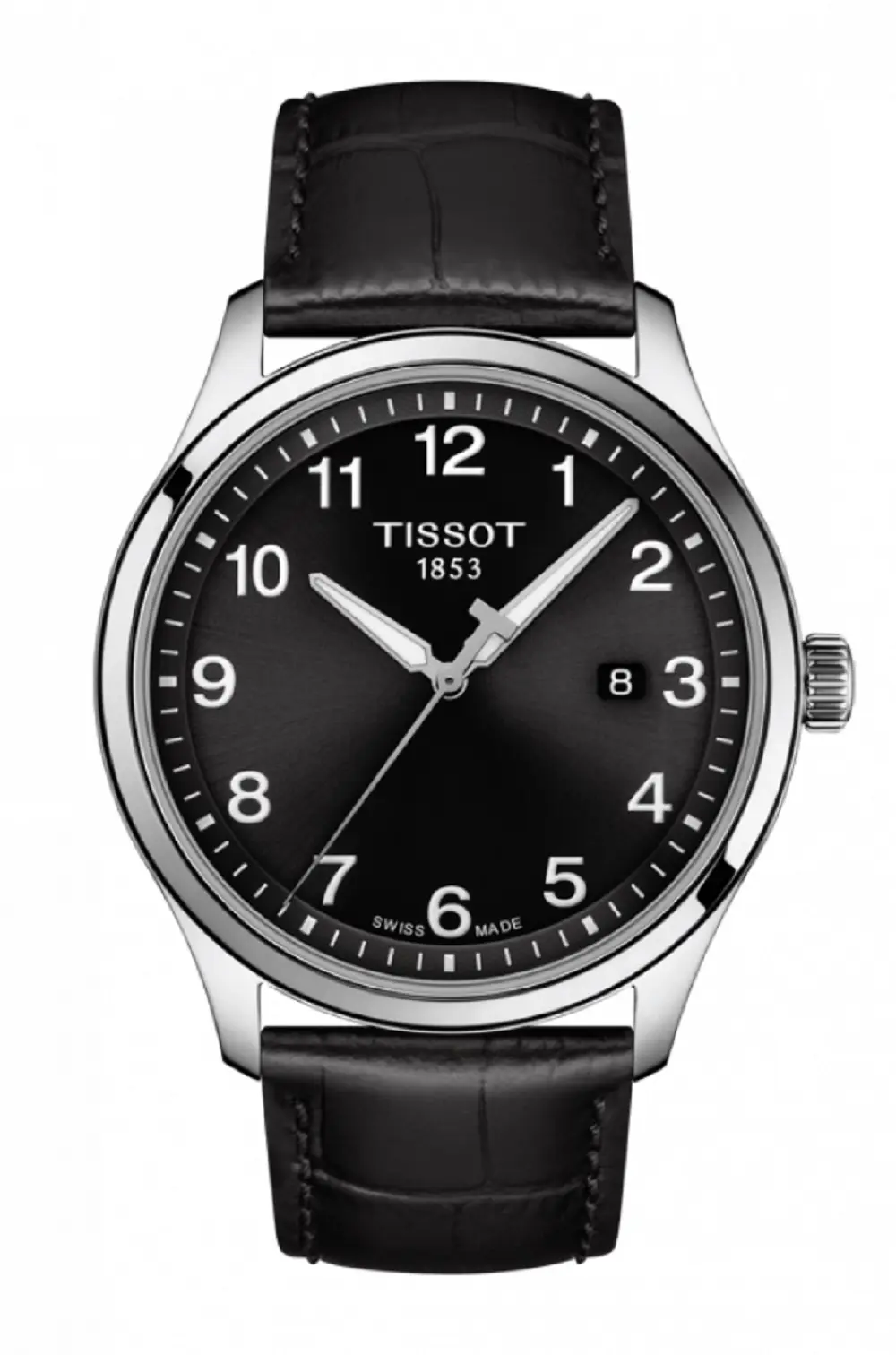 Stainless steel Tissot Gent XL Classic watch with a black arabic numeral dial on a black leather strap.