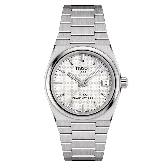 Unveiling the Tissot PRX 35mm Powermatic 80, a masterful combination of classic allure and modern refinement. This 35mm watch displays a high-quality steel case and a mesmerizing white mother-of-pearl dial, paying homage to its 1978 origins. The subtle waffle dial pattern brings a more versatile and unisex appeal than typically associated with mother-of-pearl designs. With water resistance up to 100 meters and a Nivachron™ balance hairspring, the PRX is an exquisite piece for those who appreciate the art of watchmaking. The satin-finish steel bracelet with a triple-blade folding steel clasp ensures ultimate comfort. Elevate your style with the Tissot PRX 35mm Powermatic 80 in white mother-of-pearl.