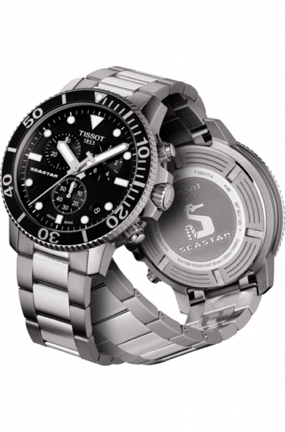 Stainless steel Tissot Seastar 1000 Chronograph mens watch with a black dial on a steel bracelet.