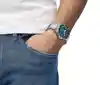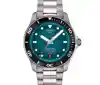 Discover the updated version of one of Tissot's main collections with the new Seastar 40mm Powermatic 80. This new edition has undergone a subtle transformation, incorporating a notch along the edges of the case, resulting in a more compact and sophisticated appearance. This automatic timepiece is the perfect watch for those in search of a sporty yet assertive accessory, offering water resistance up to 1000 feet (300 meters) and improved visibility in dim conditions thanks to the Super-LumiNova® coated hands and hour markers. Discover the unique aesthetic of this stainless steel version with its teal blue gradient dial and contrasting black bezel, following the collection's signature sporty yet bold appeal.