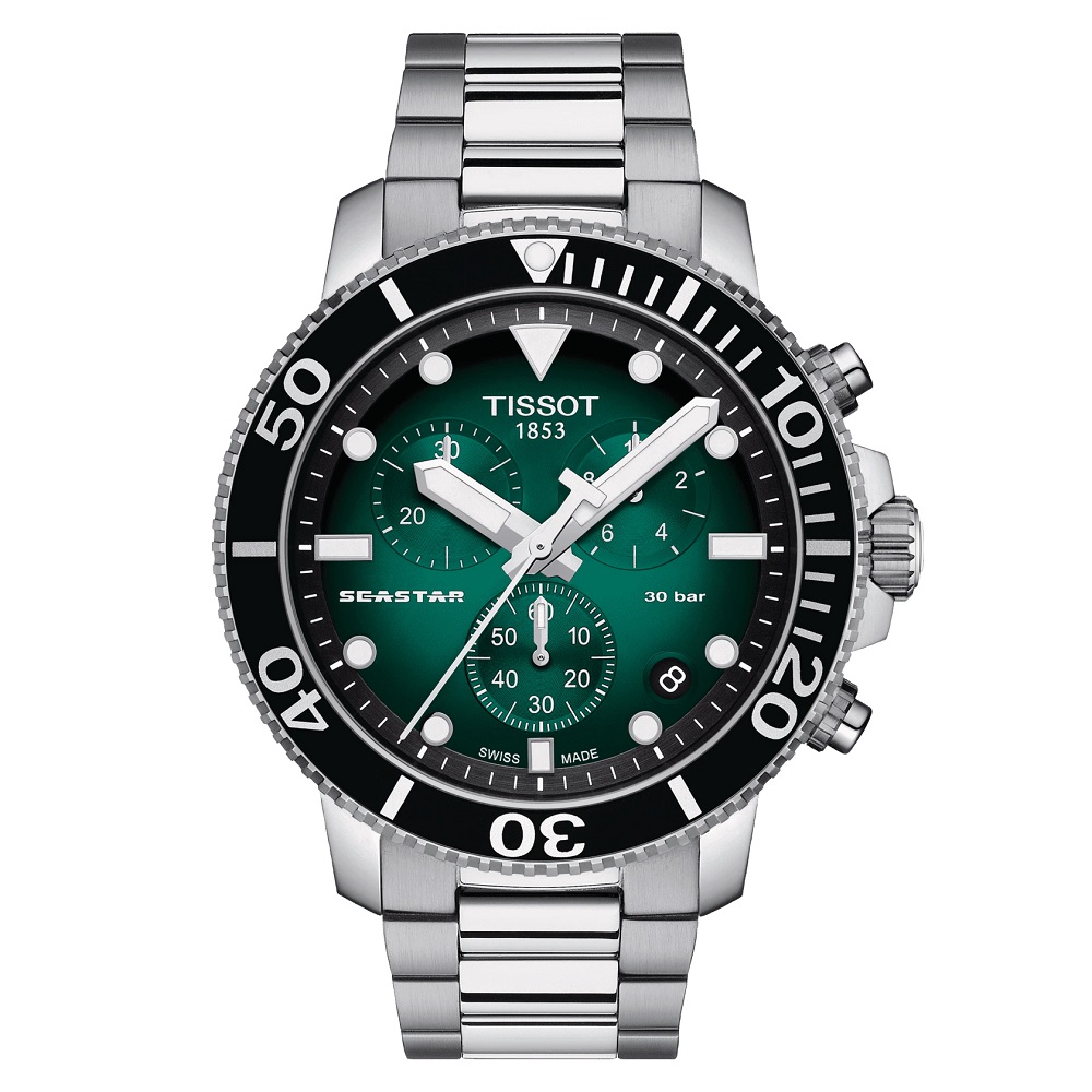 The Tissot Seastar 1000 merges style and performance without compromising either. The diving inspiration shapes both the appearance and the functionality of this watch. It maintains its performance to a pressure of 30 bar (300m/1'000ft), combining underwater sports and a preference for a sophisticated Swiss timepiece.The diving theme continues through elements such as a unidirectional bezel, a strap with a divers' safety buckle, plus luminescent hands and markings.