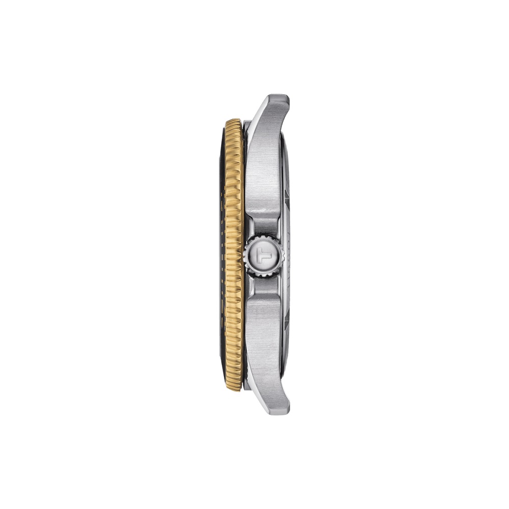 Pairing style with performance, the Seastar 1000 Quartz 40mm will soon become your everyday companion. With its black dial and gold-accented bezel, this model is a harmonious marriage of elegance and technology, bringing Swiss watchmaking know-how and eternal design together. This versatile case size is designed for people looking for a chic, day-to-night watch, keeping the promise of exceptional technical performance. As with the existing 36mm and 45.5 mm models, the Seastar 1000 Quartz 40mm models take their name from their water resistance certification of 1,000 feet, equivalent to 30 ATM or 300 metres. They offer uni-directional rotating bezels for reliable underwater-activity timing. Low-light legibility is further enhanced by the use of Super-LumiNova® on the watches’ hands and hour markers. The black rubber strap can be changed using Tissot’s easy-to-use quick strap change system, giving the owner the opportunity to choose from a wide range of compatible Tissot straps and bracelets to personalise their watch, suiting their mood or any special occasion.